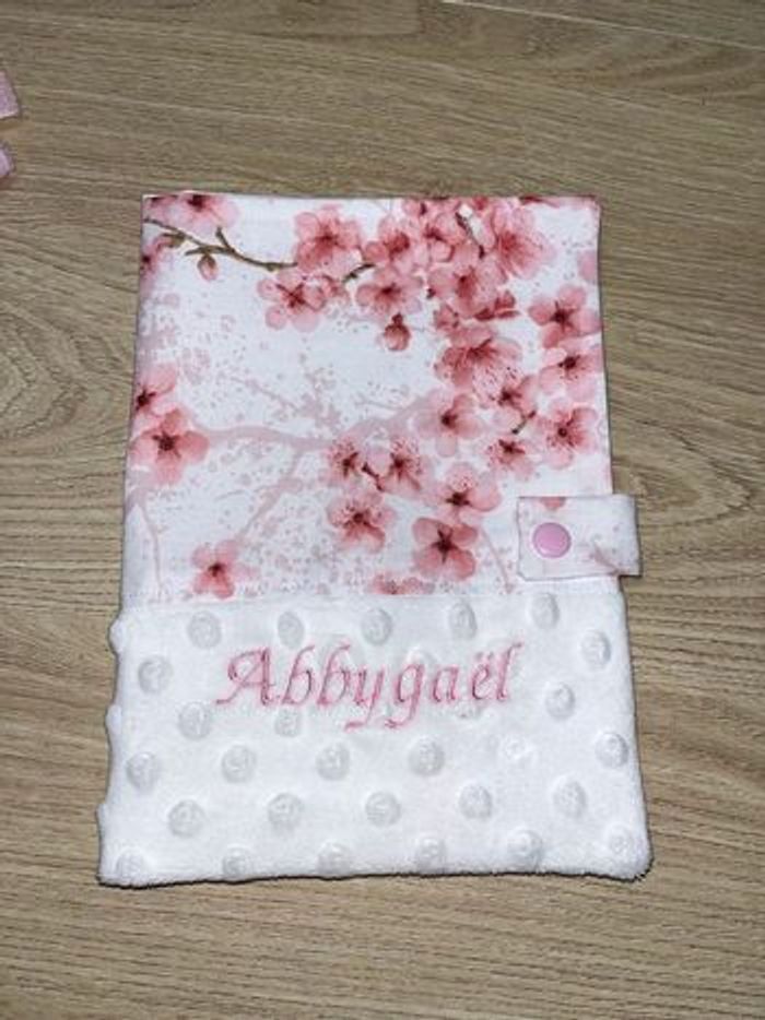 Protège carnet de santé fait main sur commande Tissu imprimé en haut ou gaze de coton Tissu tout doux en bas avec prenon brodé
