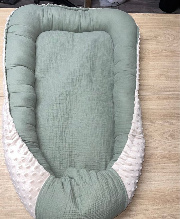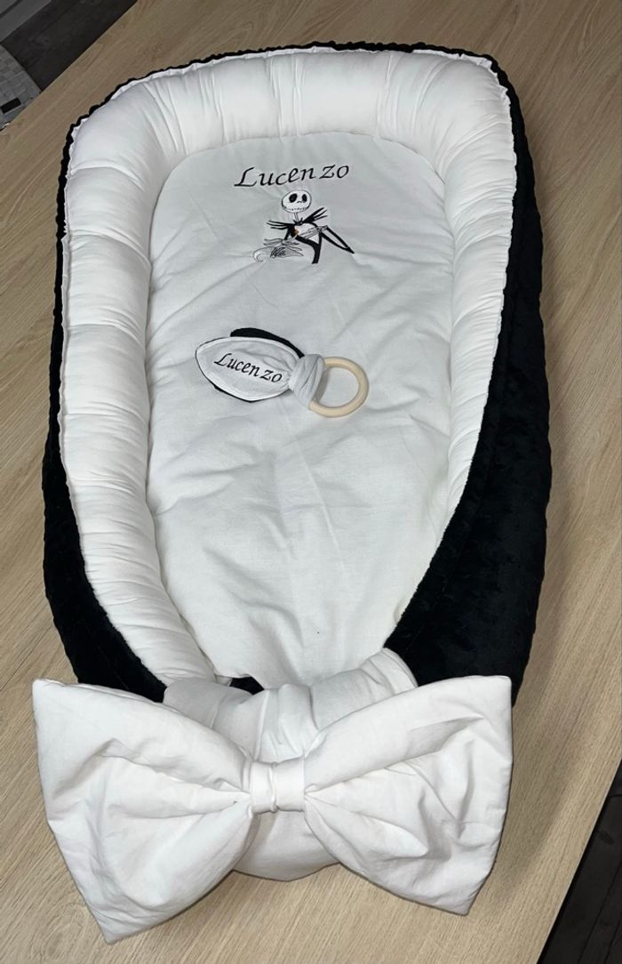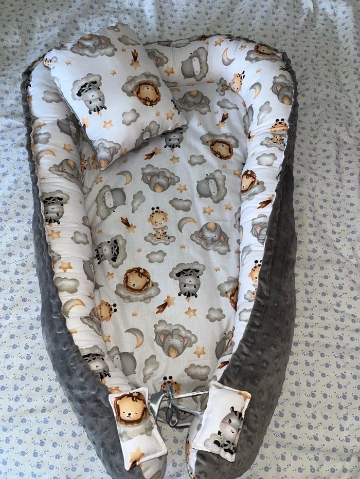 Babynest couffin réducteur de lit fait main sur commande délais 3/4 jour après paiement 2 face une en tissu coton uni ou imprimée Une face toute douce en tissu mincky Couleur au choix me demander les tissu disponible taille environ de la naissance à 9 mois lavable en machine Tarif 43 euro le couffin dessin brodé plus 5 euro prénom plus 3 euro Ensemble couffin coussin plaid prénom sur le plaid 65 euro