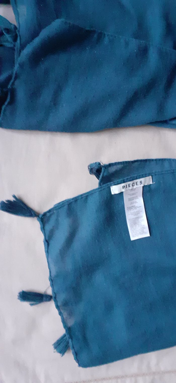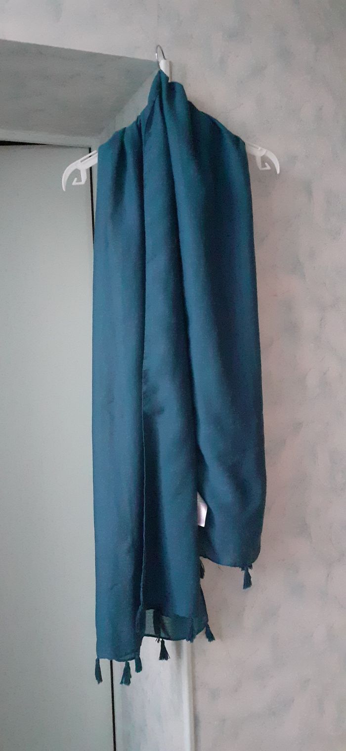 Vends une grande écharpe fine et douce, 90 % polyester, 10 % viscose, couleur bleu pétrole uni. Longueur : 184 cm Largeur : 89 cm.