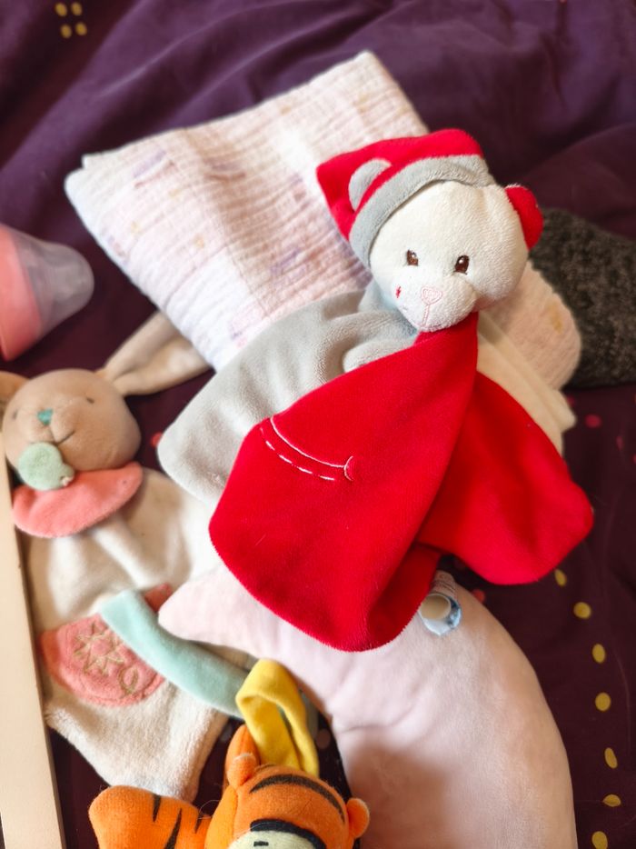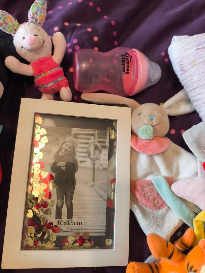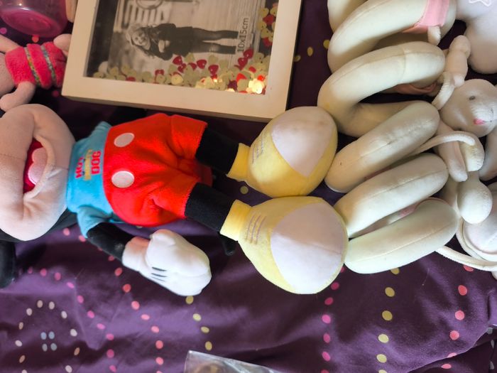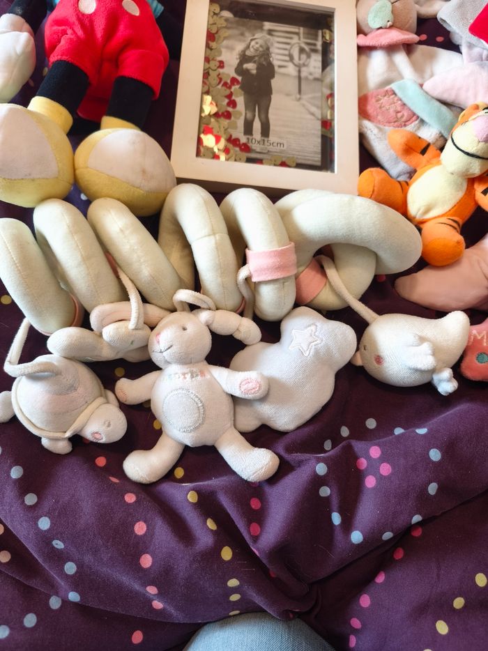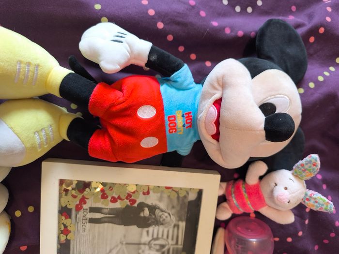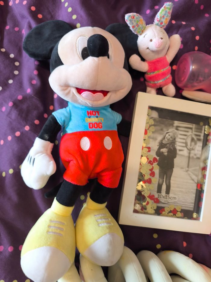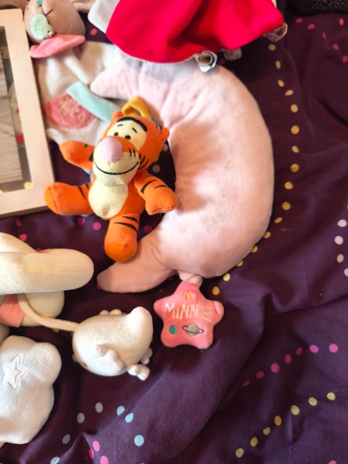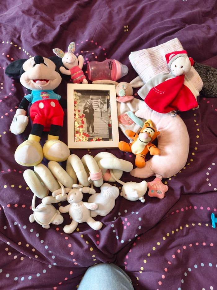 Ce lot contient : ---) 1 peluche Mickey musical en bon état ---) 1 boite à musique à accrocher Minnie en très bon état ---) 1 cadre photo en bon état ---) 1 biberon tommee tippee en bon état ---) un jouet absorba a accrocher à la poussette en bon état . ---) 2 doudou. En bon état ---) 1 Tigrou à accrocher en bon état ---) 1 doudou porcinet en bon état ---) 1 lange en bon état