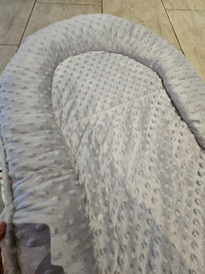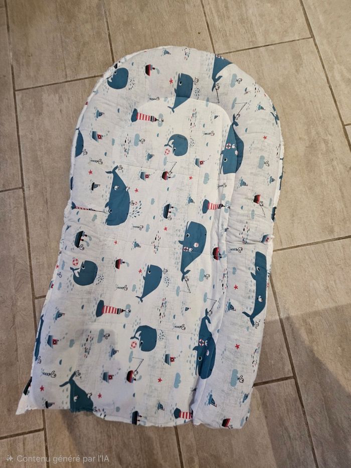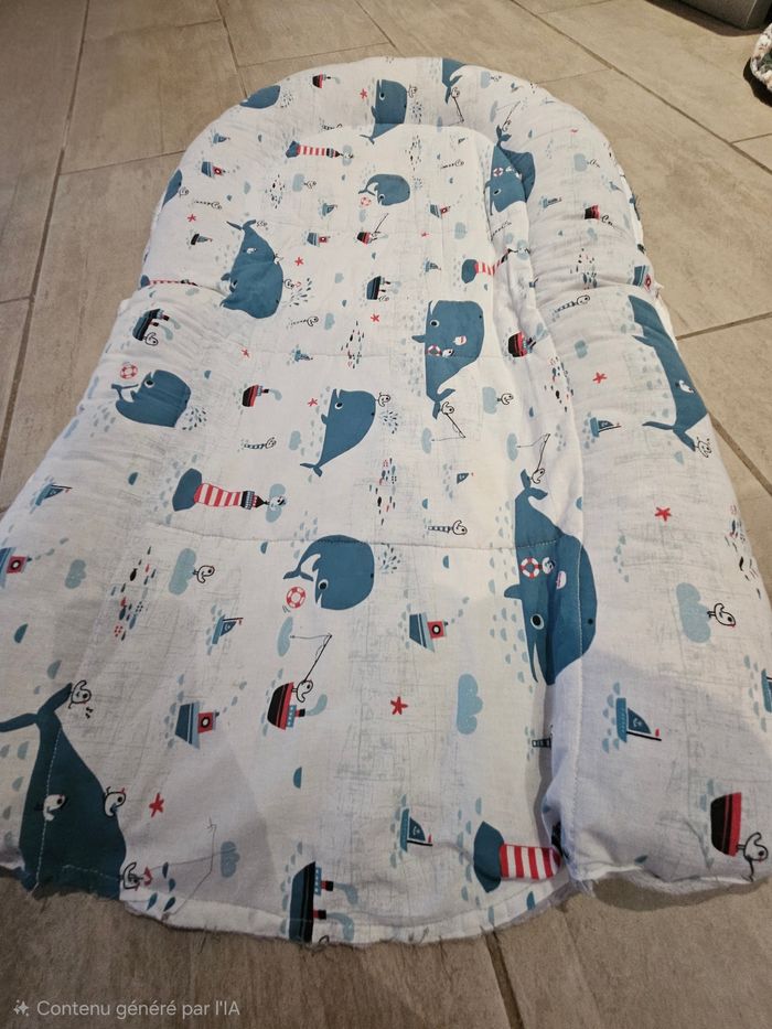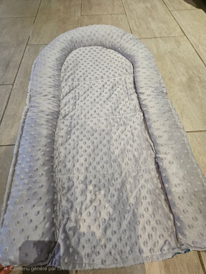 Coussin pour mettre dans le lit bébé ou dans le parc. Utilisé quelques fois par mon fils, mais il ne l'appréciait pas. Réalisé par une artisante, à la maison, superbe qualité, tissus doux et agréable au touché. Dimensions : 95 cm par 55 cm.