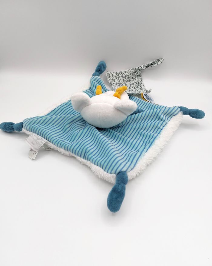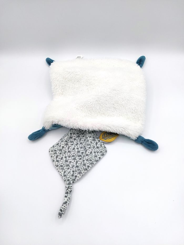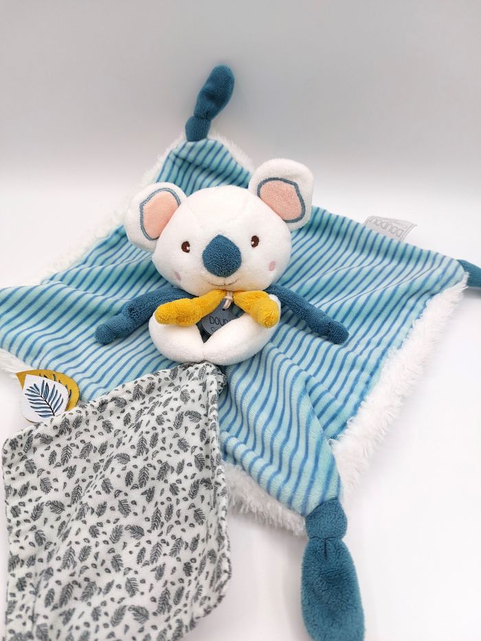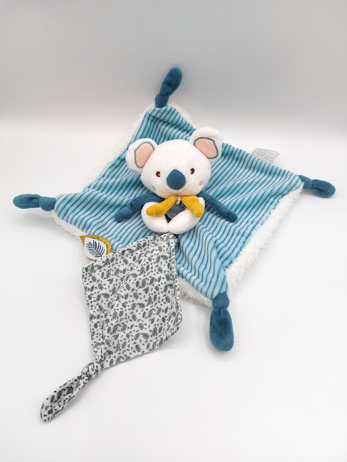 Doudou plat koala blanc bleu jaune Doudou et Compagnie DC3668 rayures feuilles Très bon état général juste une réparation visible qui a été faite sur la nouette du mouchoir (voir photo 6) Envoi rapide Réf A12728 #doudouetcompagnie #doudou #koala #peluche
