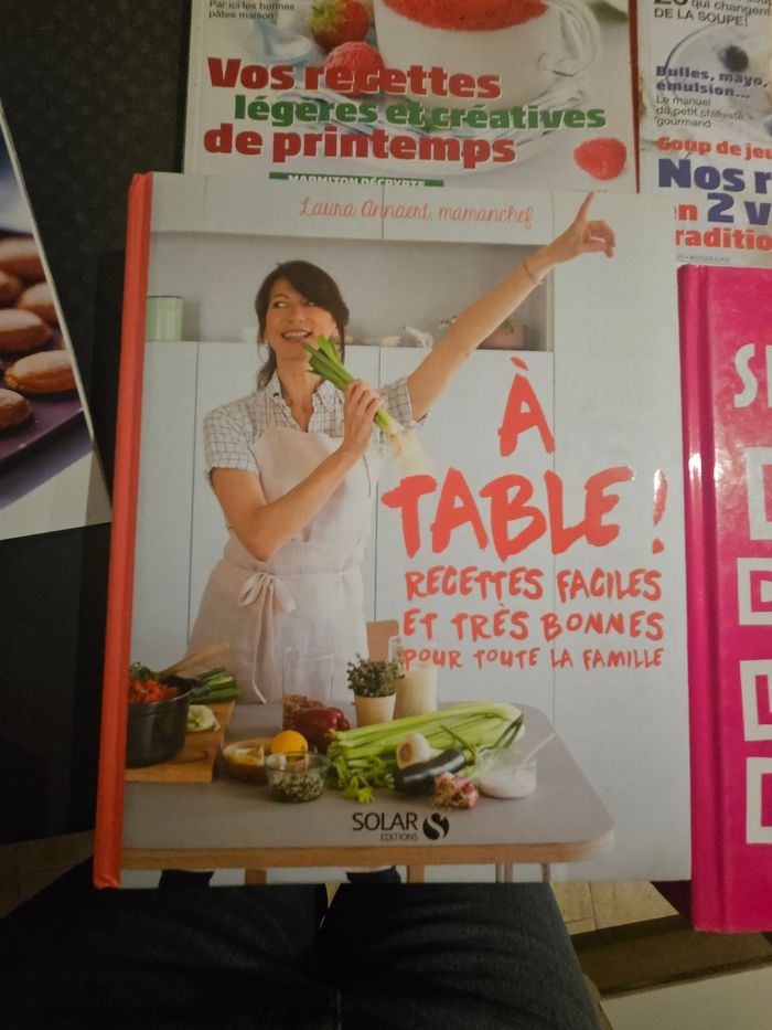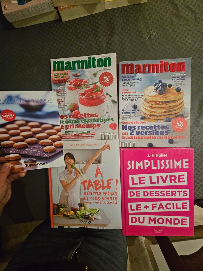 Plusieurs livres presque neufs (utilisé une ou deux fois) - livre Simplissime, JF Mallet : le livre de desserts le plus facile du monde - A table ! Recettes faciles et bonnes, solar édition - 2 magazines Marmiton - un petit livret Tupperware pour feuille à rebord