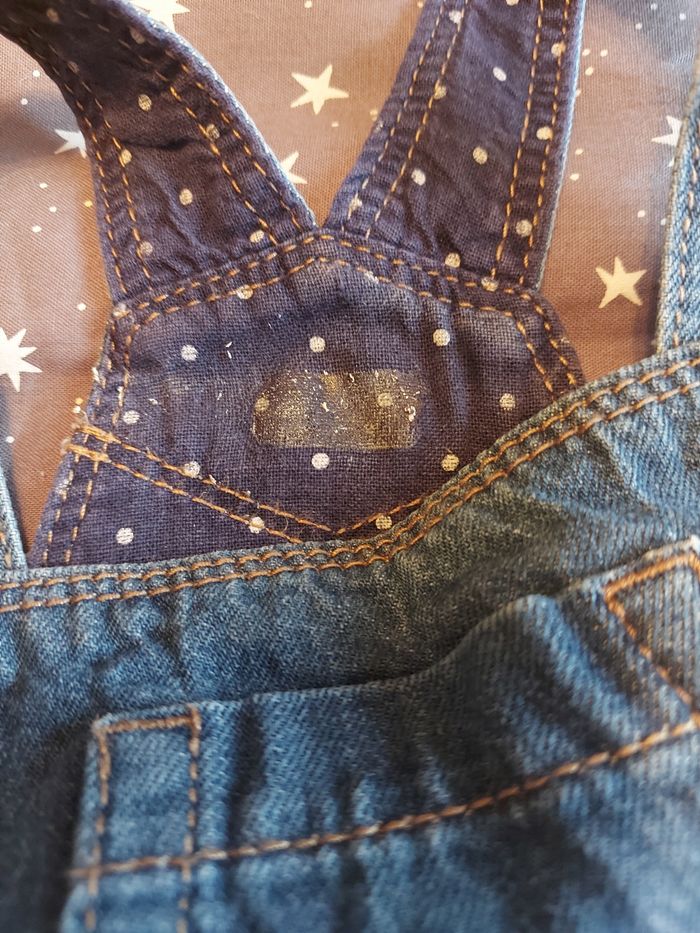 Robe salopette jean Résidu de colle dû à l'étiquette thermocollante