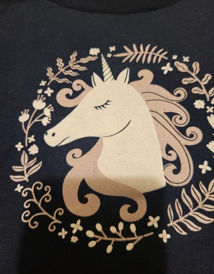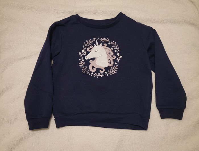Pull bleu marine Taille 5 ans Motifs : licorne un peu abîmée du aux lavages et un peu bouloché