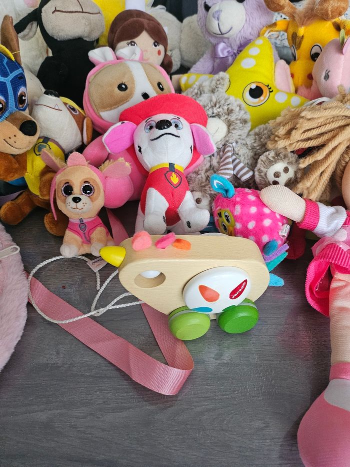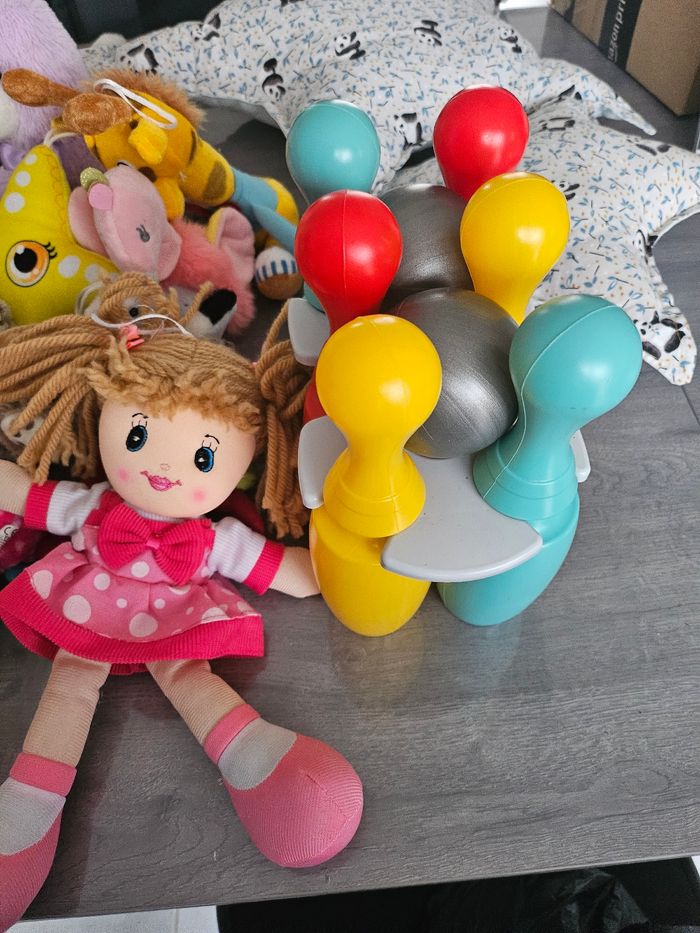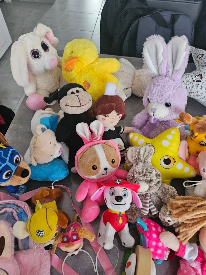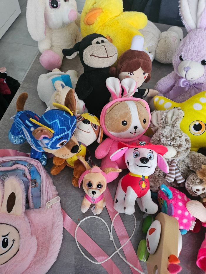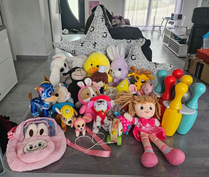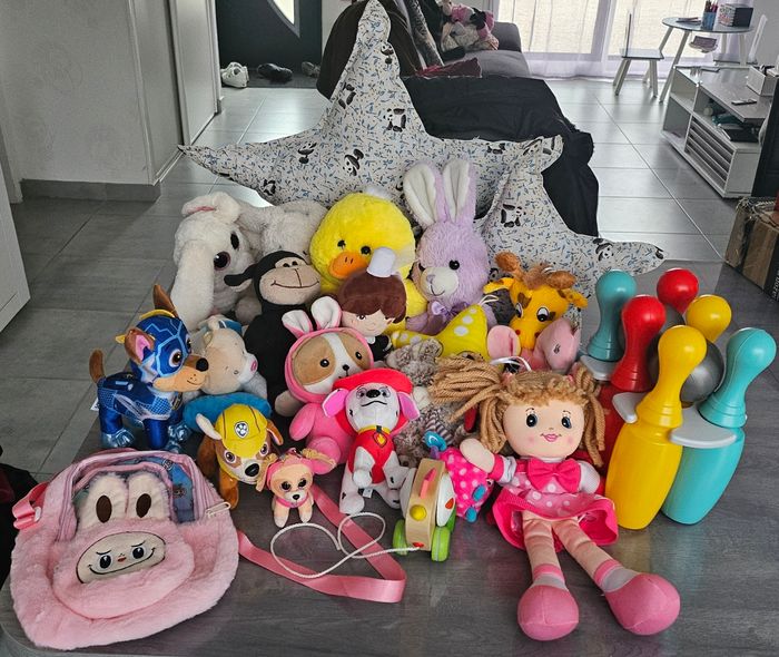 Lot composé de: 1 jeu de quilles en plastique 1 jouet a tirer 1 poupée chiffon 1 sac a dos 1 peluche canard qui fait du bruit lorsque l'on appui dessus 1 lapin qui ne marche pas 12 peluches divers + lapin et canard + 4 pat patrouille Lot indissociable