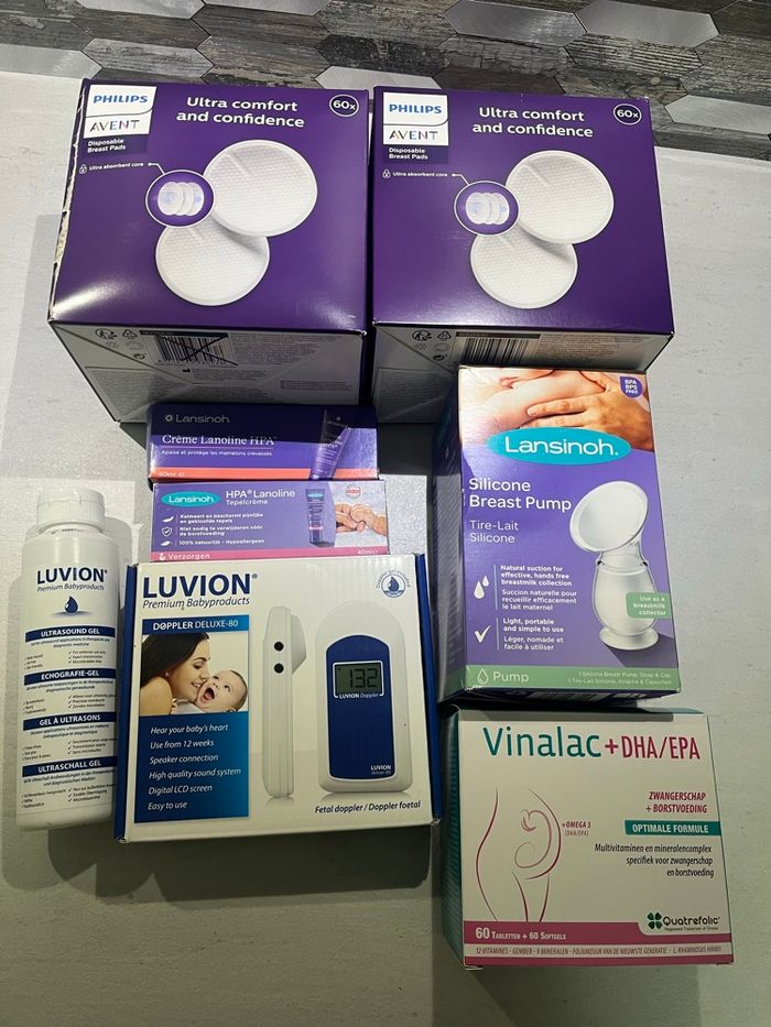 Lot grossesse/allaitemant - 2 boîtes de coussinets Avent (une dizaine utilisés dans 1 boîte, l’autre boîte neuve. ) - 1 collecteur de lait Lansinoh - 1 boîte de vitamine Vinalac ( 3 gélules manquantes) - 1 Doppler Luvion (avec produit et écouteur) - 2 crèmes Lansinoh