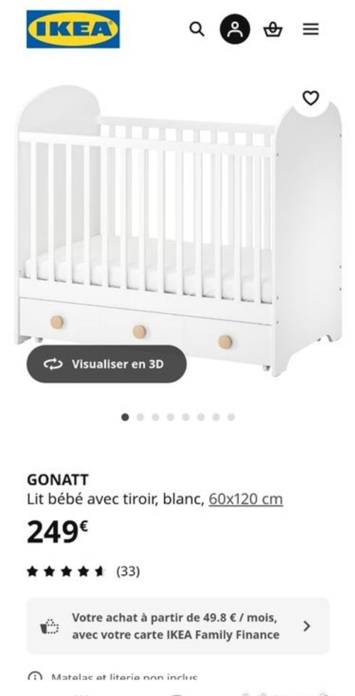 Lit barreaux GONATT ikea 60x120cm Utilisé même pas un an car finalement passé sur un lit montessori au sol donc en excellent état, facture à l'appui A venir récupérer sur vitrolles de préférence, donc pas de livraison merci Lit démonté