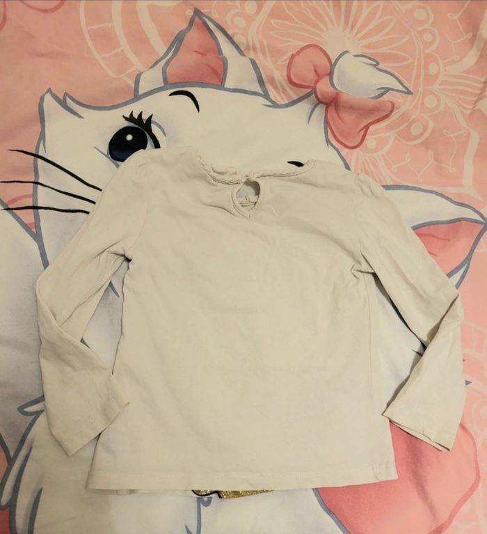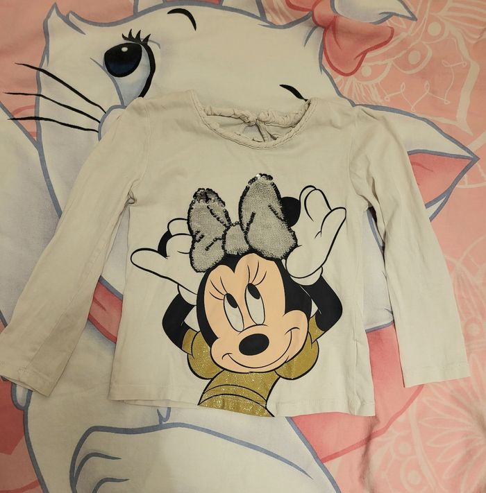 Haut à manches longues en jersey doux avec imprimé Minnie et sequins réversibles. Encolure avec garniture à ruchés et application tressée. Découpe en goutte d'eau avec bouton dans la nuque Taille 4 ans (104 cm) Un peu bouloché et un peu décoloré et une micro tâche très peu visible