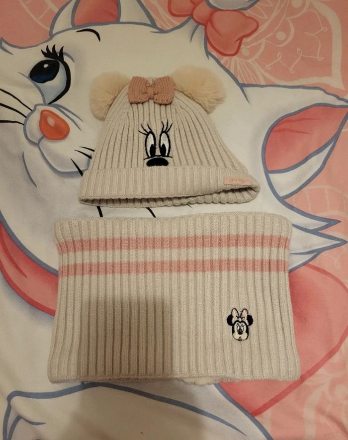 Ensemble bonnet + cache cou Bonnet ludique. Pompons en fausse fourrure et nœud 3D sur le dessus. Visage de Minnie (Disney) brodé sur le devant. Revers à la base avec étiquette tissée en lurex doré à l'avant. Tour de cou. Bandes contrastées roses. Patch brodé Minnie sur le devant. Taille 5/8 ans Un peu bouloché mais reste en très bon état car pas de tâches pas de trous