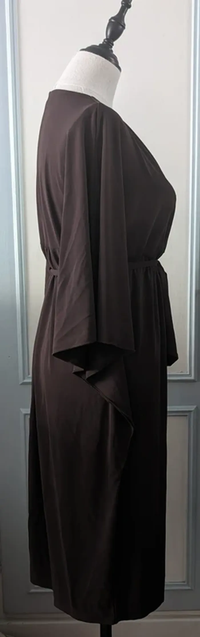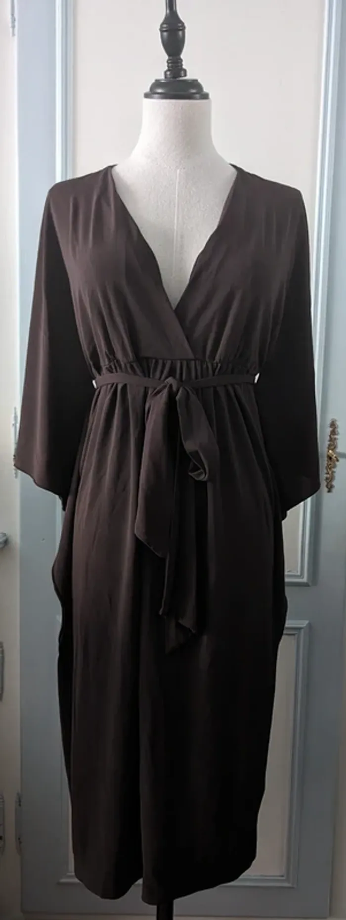 Robe fluide de marque Jo No Fui, manches 3/4, taille M, 73% acétate, 18% nylon, 9% élasthanne. Couleur marron, lanière. Longueur totale: 96cm