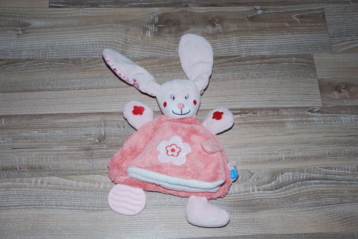 Doudou Eveil Activités Lapin Rose Livre Fleurs Anneau de Dentition Tex Baby hauteur 20 cm Très bon état faisait parti d'une collection de plus de 200 doudous, jamais caliné ni toutouillé, environnement non fumeur