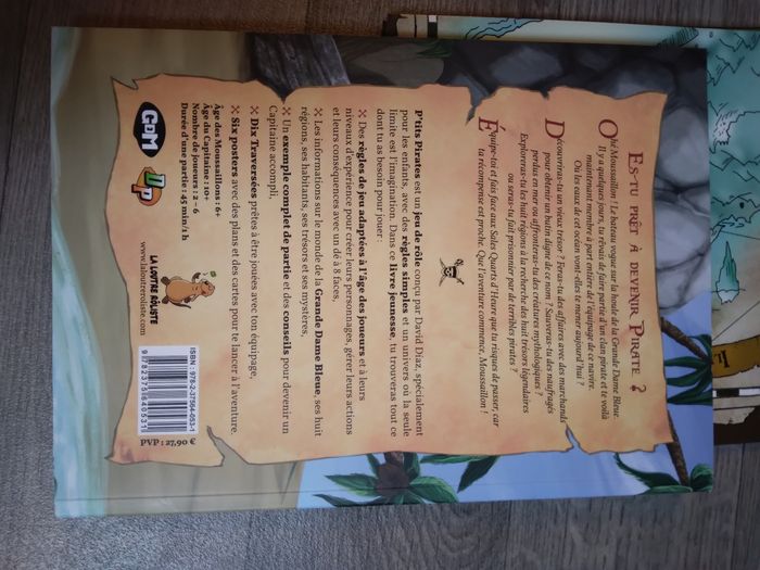 P'TITS PIRATES est un jeu de rôle pour enfants à partir de 6 ans, dans lequel ils joueront de jeunes et intrépides pirates parcourant les huit régions qui composent la Grande Dame Bleue Neuf non utiliser, le plastique qui l'entourer était ouvert et pas jolie pour la vente, j'ai préféré le retirer
