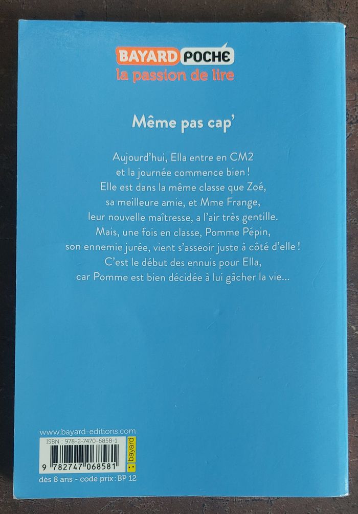 Livre le journal d Ella - Tome 1 "Même pas cap" en parfait état comme le montre les photos. Résumé : Aujourd'hui Ella entre en CM2 et la journée commence bien ! Elle est dans la même classe que Zoé, sa meilleure amie et Mme Frange, leur nouvelle maîtresse, a l'air très gentille. Mais, une fois en classe, Pomme Pépin, son ennemie jurée, vient s'asseoir juste à côté d elle ! C'est le début des ennuis pour Ella, car Pomme est bien décidée à lui gâcher la vie... Disponible à Pessac ou en livraison. 🙂 Négociation possible ainsi que réduction par lot.