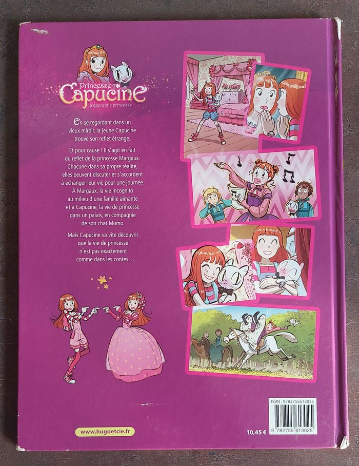 BD Princesse Capucine - Tome 1 : L'apprentie princesse en bon état, traces d'utilisation comme le montre les photos. Acheté 10.45€ vendu 5.22€ soit 50% de réduction. Résumé : En se regardant dans un vieux miroir trouvé chez son grand-père, la jeune Capucine trouve son reflet étrange. Et pour cause ! Il s'agit en fait du reflet de la princesse Margaux. Chacune dans sa propre réalité, elles peuvent discuter et s'accordent à échanger leur vie pour une journée. À Margaux, la vie incognito au milieu d'une famille aimante et un groupe d'amies de notre époque, de découvrir la vie avec sèche-cheveux et téléphone portable. À Capucine, la vie de Princesse dans un palais, de belles robes, une calèche Mais Capucine va vite découvrir que la vie de princesse n'est pas exactement comme dans les contes et que Margaux n'a aucune envie de reprendre sa place L'aventure commence alors pour Capucine. Il s'agira de se glisser au mieux dans la peau de la princesse pour leurrer sa Cour et son fiancé notamment. En échangeant leur vie pour une journée avec la princesse Margaux, Capucine ne savait pas à quoi elle s'exposait Sa bonne humeur, sa cordialité avec tous les personnages de son nouvel entourage la rendront vite suspecte aux yeux des personnes les plus proches d'elle, tandis que Margaux profitera bien d'une existence beaucoup plus normale ! Disponible à Pessac ou en livraison. 🙂 Négociation possible ainsi que réduction par lot.