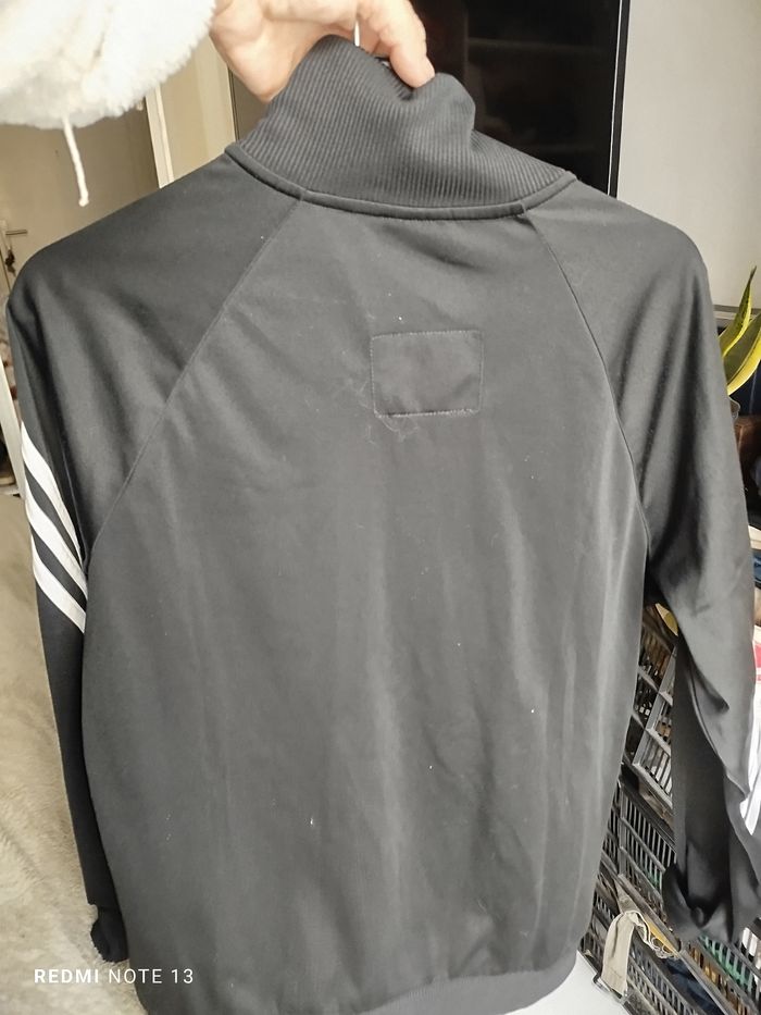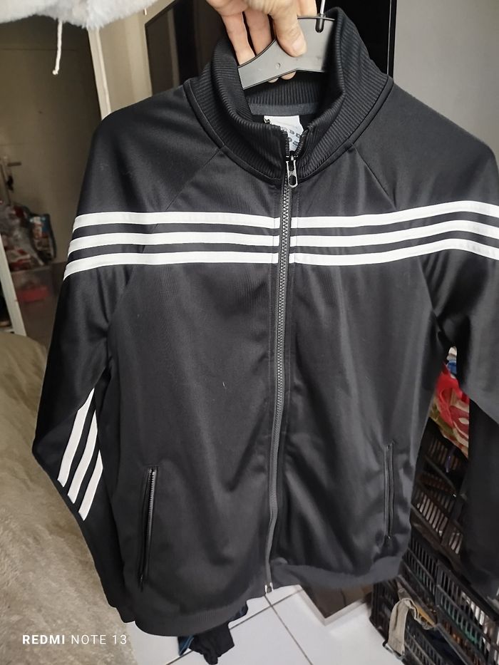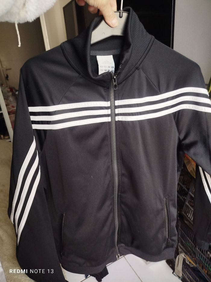 #kytie40unisexe. Veste de survêtement taille 40/42 de couleur noire avec les bandes blanches de marque Adidas poche zippée légère satiné à l'extérieur 100 % polyester intérieur très doux mais ça neuve mesure des épaules 40 cm/42 cm des aisselles 50 cm hauteur 65 cm ref B40
