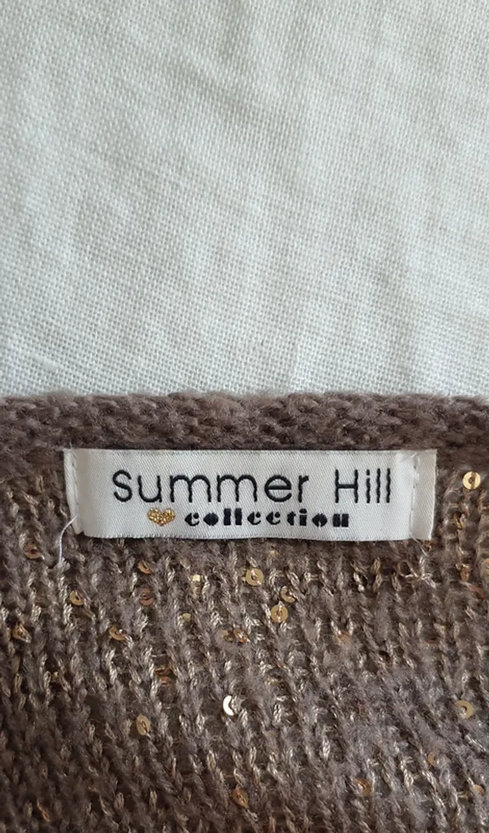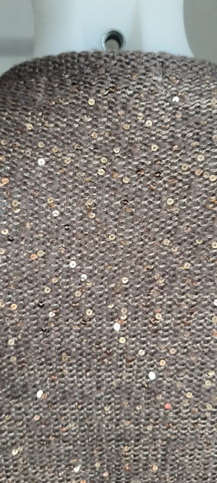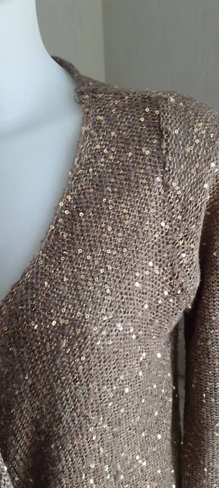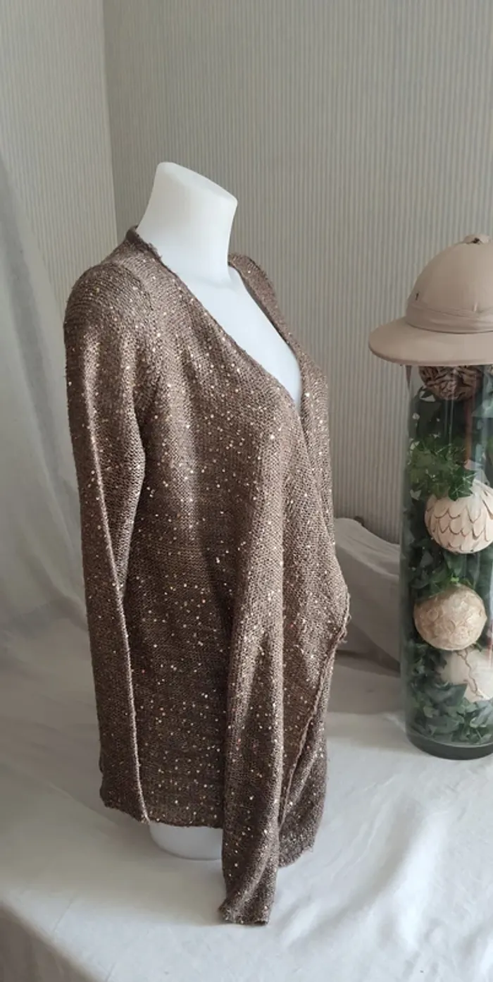 Gilet femme #Summer Hill, taille S Beige avec sequin or et fils or, manche longue 70% acrylique, 25% polyester, 5% paillette Dimensions à plat: épaule 36 cm., sous aisselle 44 cm., hauteur 64 cm.