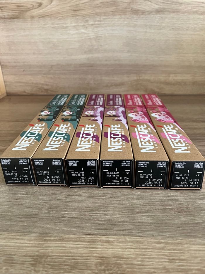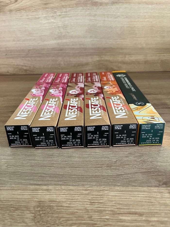 Lot de 120 capsules compatibles Nespresso. 1 paquet de Starbucks blond intensité 6 Nescafé farmers origins: 2 south Asia intensité 12 2 India intensité 9 4 Mexico intensité 7 2 Colombia intensité 6 1 Andes intensité 5 Les dates vont de juillet à novembre 2026