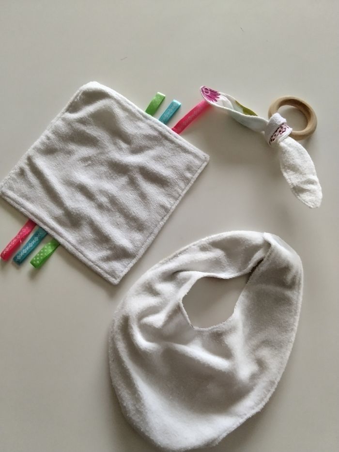Ensemble de serviette, bavoir et anneau en bois - photo numéro 1