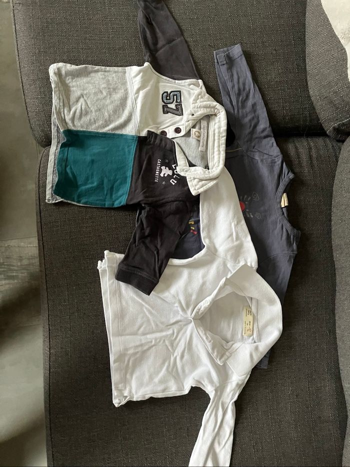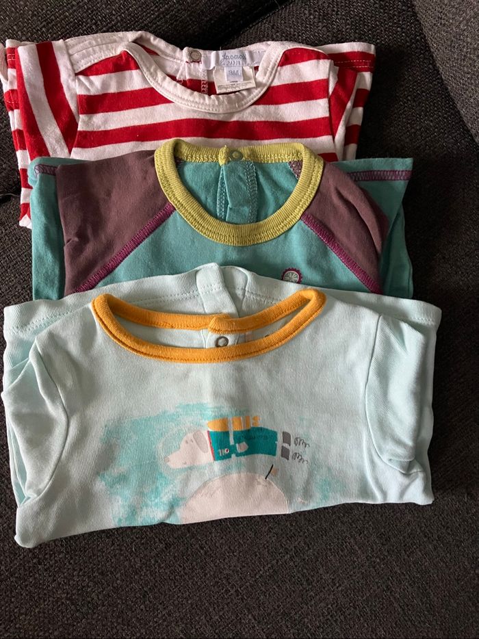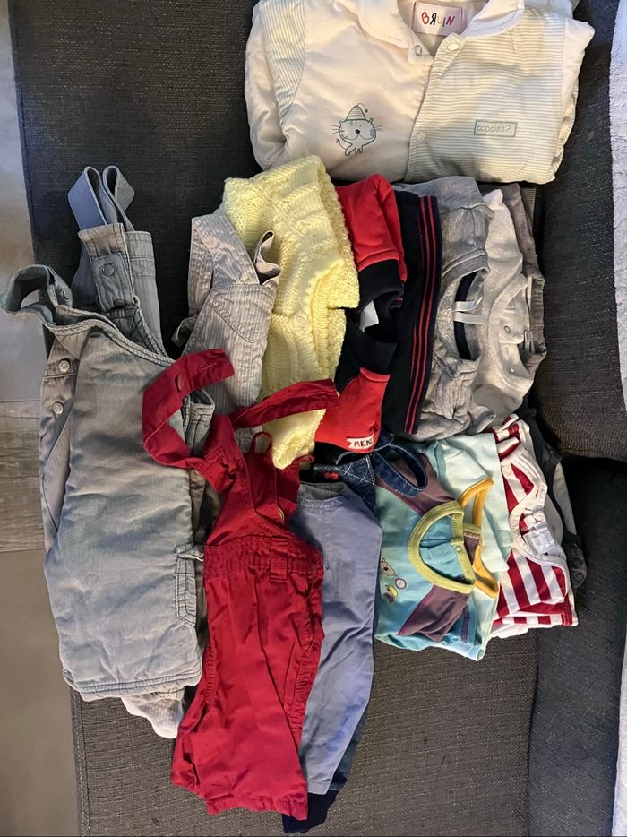 Lot de 18 pièces comprenants - 6 salopettes en 3 mois - 3 manches longues en 3 mois - 3 manches longues en 6 mois - 1 veste en 1 mois - 1 pull en 3 mois - 1 petite veste en 6 mois - 1 haut de pyjama en 6 mois - 1 gilet fait main équivalent en 6 mois - 1 sur pyjama en 6 mois En très bon état pour la majorité sinon en bon état Divers marque: bruin, jacasi, orchestra, obaibi, sergent major…