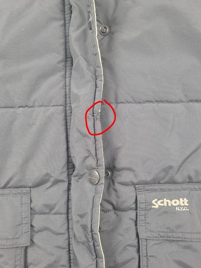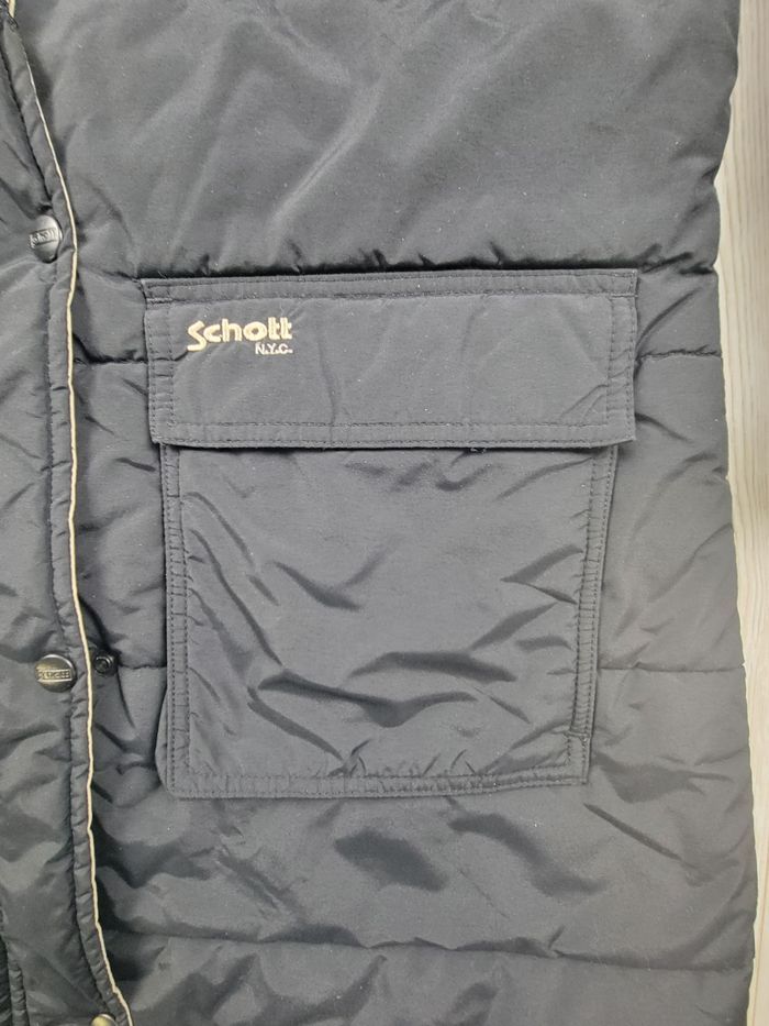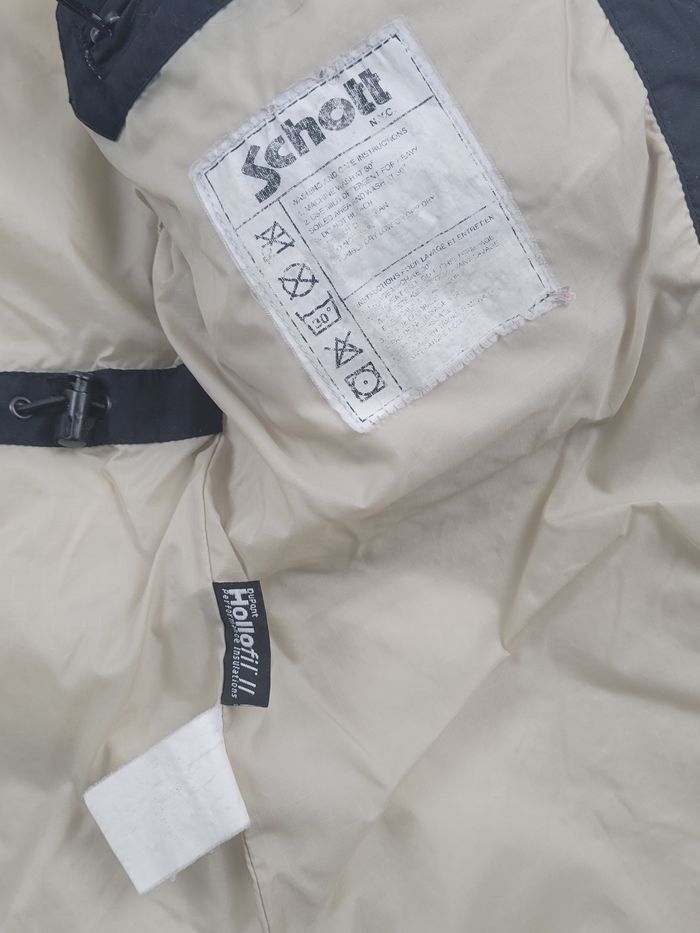 Manteau Rose Schott by Schott NYC, coloris noir, coupe légèrement cintrée. Modèle chaud et confortable, équipé d’une doublure Dupont Hollofil II, reconnue pour ses performances thermiques. Fermeture centrale par zip gris + pressions, en très bon état. Deux grandes poches frontales avec inscription Schott. Intérieur soigné avec deux poches. Taille : M (homme) Convient à un M ajusté ou à un S ample selon morphologie. Mesures à plat : – Épaules : 52 cm – Manches : 54 cm – Longueur : 81 cm Très bon état général. Capuche zippée manquante Petite reprise discrète sur un rabat avant. Étiquette de composition illisible (usure), étiquette Dupont Hollofil II bien présente. Envoi rapide et soigné sous 24–48 h. #30-03