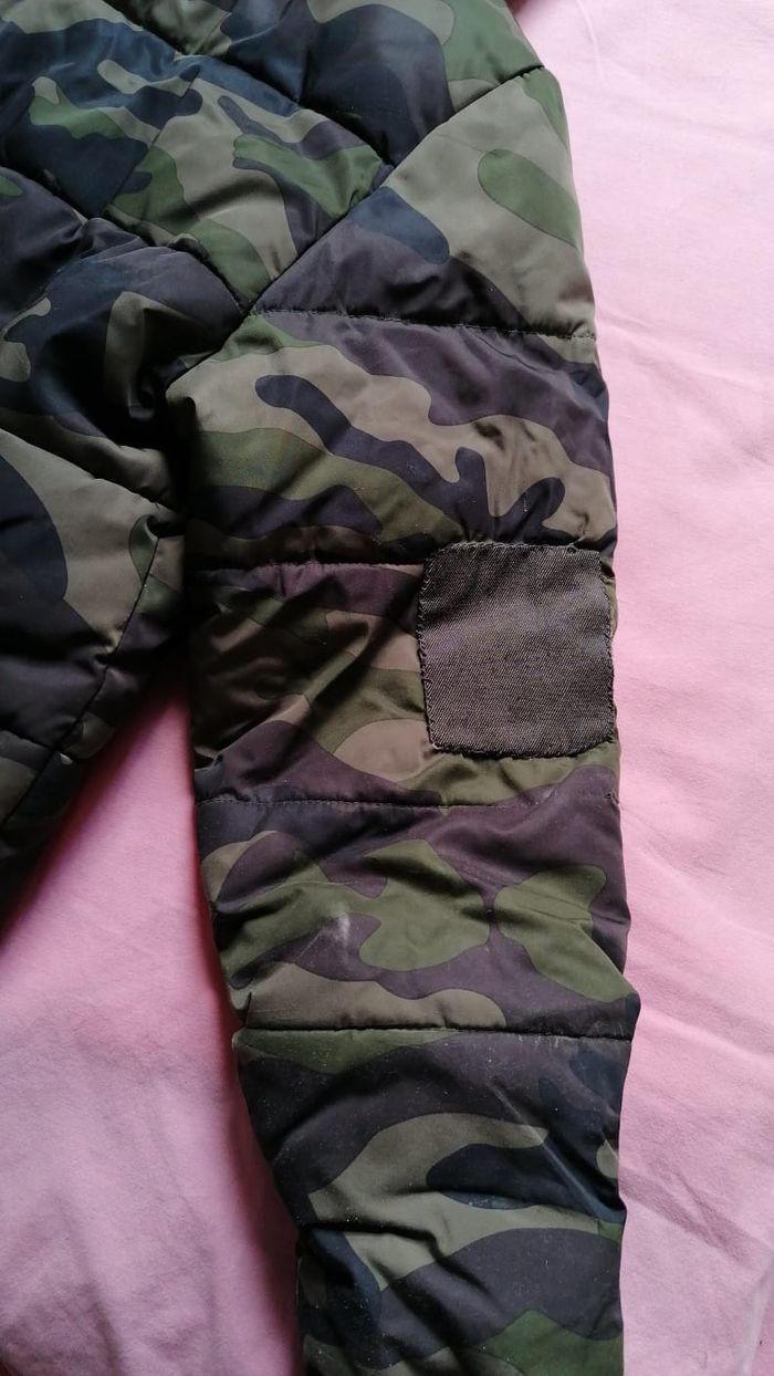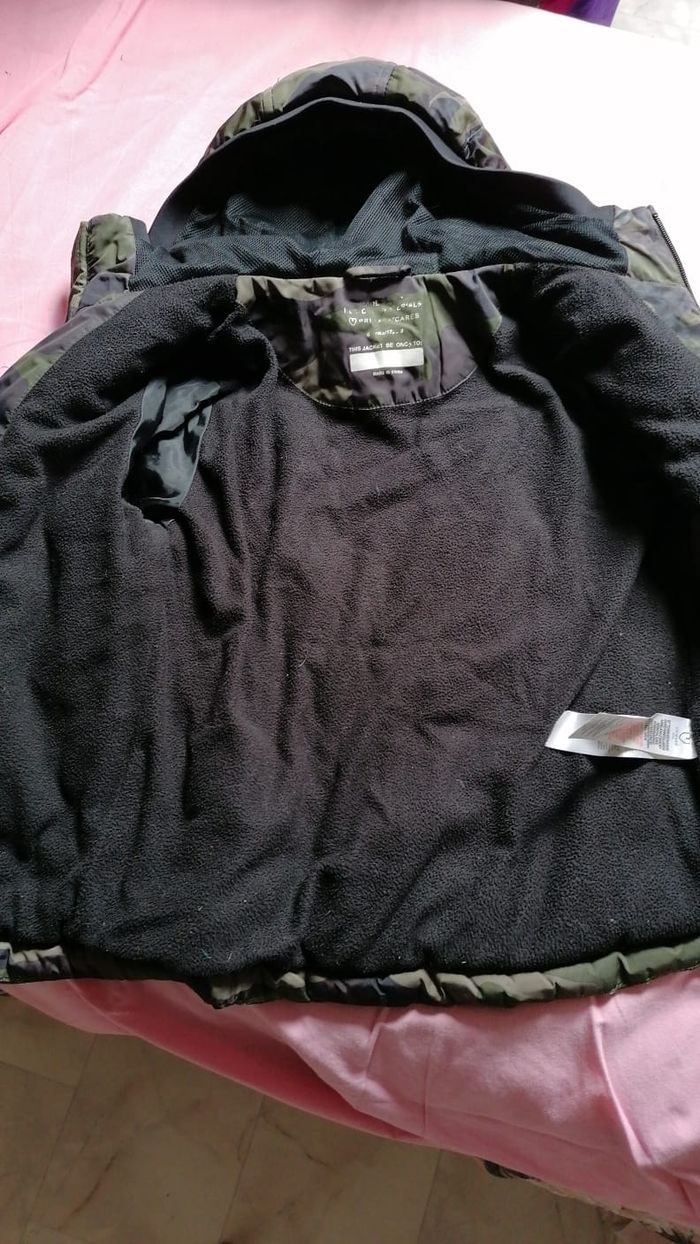 Anorak garçon, doublé polaire, très chaud, capuche, 2 poches extérieure + 1 poche intérieur, a été réparé sur la manche droite. 100 % polyester. Bon état couleur kaki et marron style camouflage