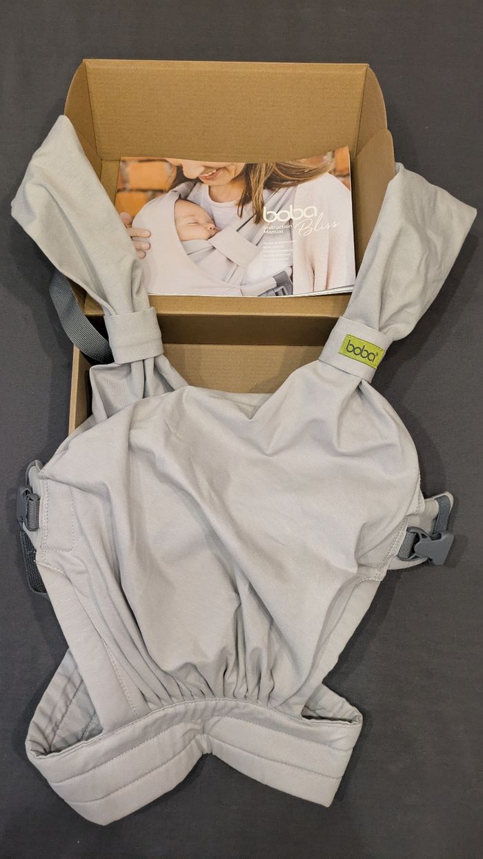 Porte-bébé hybride Boba Bliss Gris Acheter sur Maman Natur'elle Très peu servi, très bon état Manuel d'utilisation inclus Pratique et léger Idéale naissance jusqu'à 18 mois