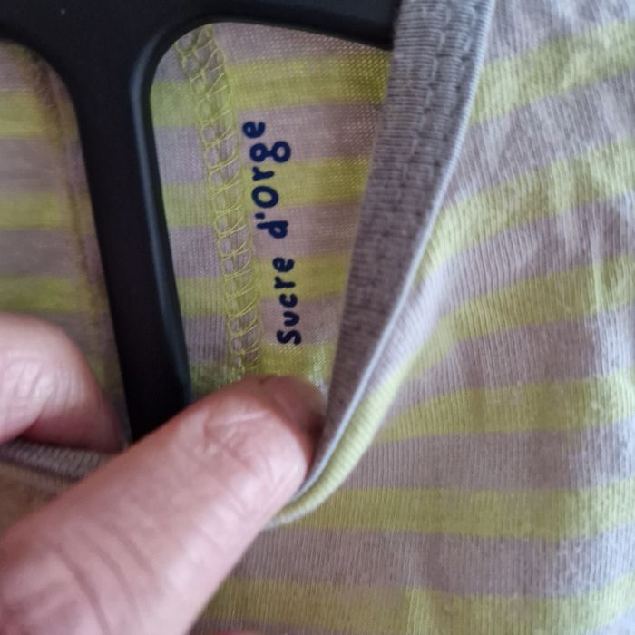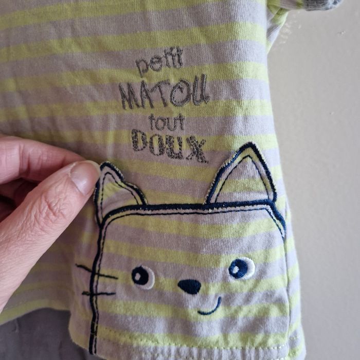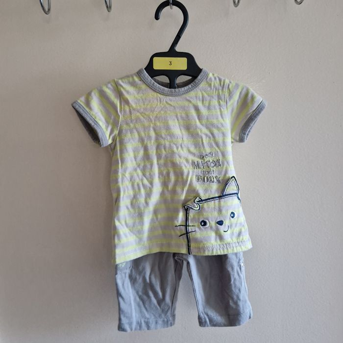 💐Négociation acceptée sur lot💐 Ensemble 1 mois Haut raye gris et jaune Pantalon gris Parfait etat Mon petit chaton Marque sucre d orge