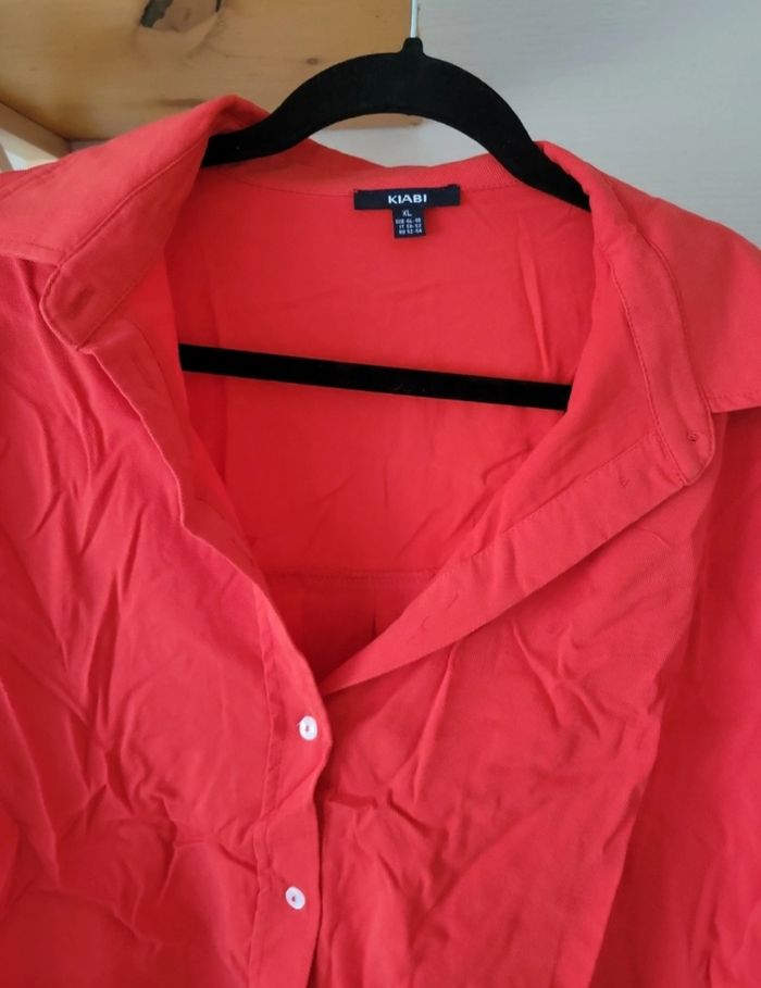 Chemise orange foncé, marque Kiabi, taille XL(rayon grande taille). Désolé elle a des plis je ne repasse pas. Très bon état.