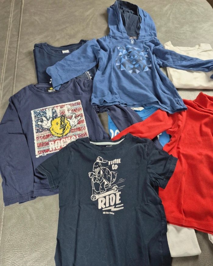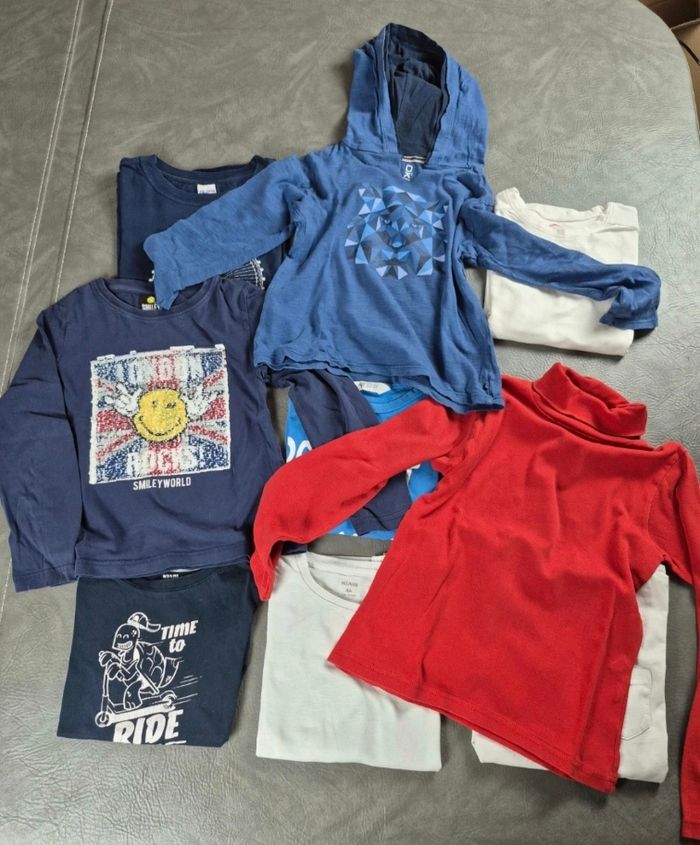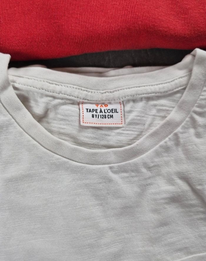 Description : • Taille : 8 ans • Coloris : Variés (blancs, rouge, autres) • Détails : 2 manches courtes, 7 manches longues dont 1 à capuche T-shirt avec smiley à paillettes mobiles 2 blancs en bon état, le reste en très bon état 1 rouge col roulé • État : 2 en bon état, le reste très bon état 📏 Dimensions visibles sur les photos 📦 Envoi rapide sous 24/48h ☺️ Réductions dès 2 articles 💚 D’autres vêtements sur mon profil A59