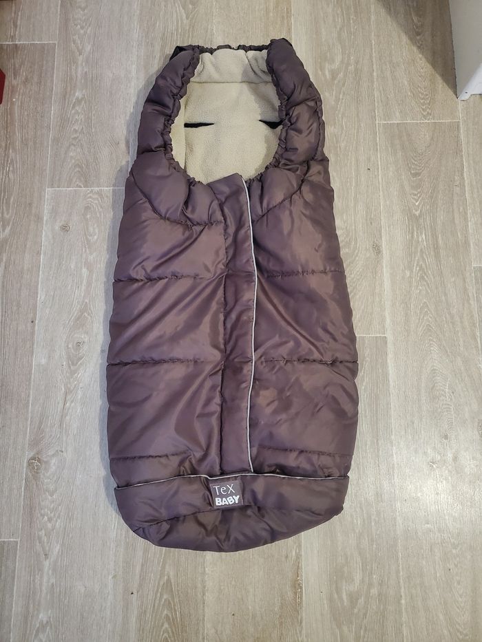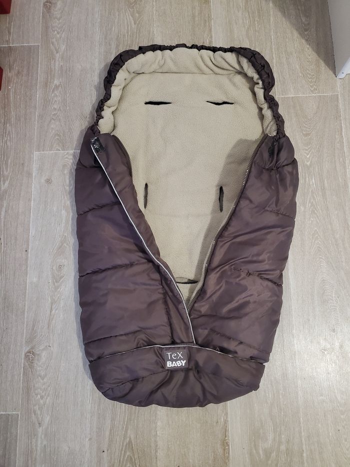 Superbe chancelière 6-12mois Imperméable Couleur marron chocolat et beige Fermeture éclair Harnais 5 trous Tex baby Très bon état