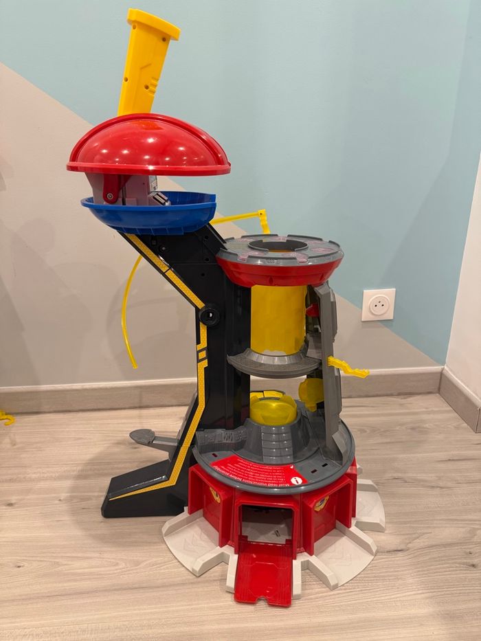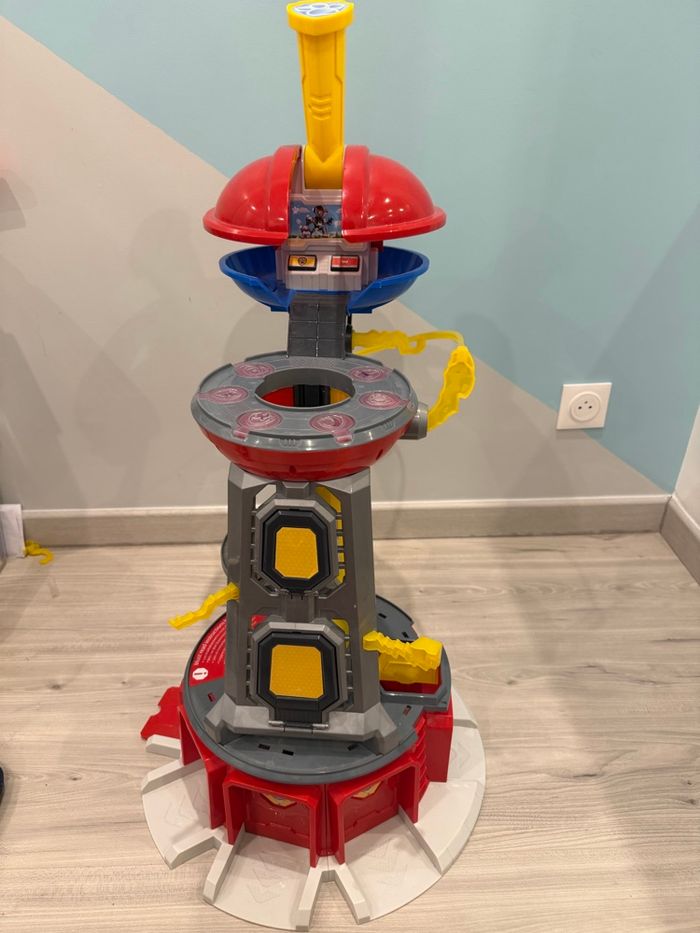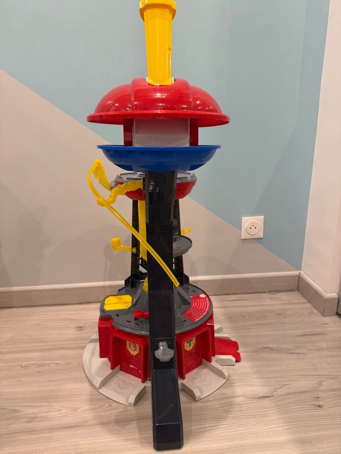 Tour pat patrouille xxl, elle fait plus de 80cm de haut. En très bon état, seule la rampe jaune qui faisait le tour est cassée mais ne sert en rien pour jouer. Son et lumière fonctionnels. Encore vendue sur internet plus de 190€ au plus bas prix.