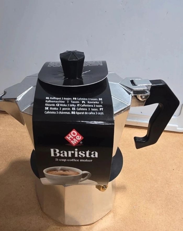 vendre : une superbe cafetière italienne moka de la marque HOme, modèle Barista, d'une capacité de 3 tasses. Idéale pour les amateurs de café souhaitant savourer un espresso riche et aromatique à la maison. Cette cafetière, jamais utilisée, et toujours avec son bandeau d'emballage d'origine. Son design classique en aluminium poli, avec une poignée et un bouton noirs ergonomiques, lui confère une allure élégante et intemporelle. Facile à utiliser et à nettoyer, elle vous garantit une préparation simple et rapide pour un café d'excellente qualité. Parfaite pour offrir ou pour équiper votre cuisine si vous appréciez l'authentique goût du café moka. Vendue car double emploi. #café #barista #cafetiere #cafetierevintage