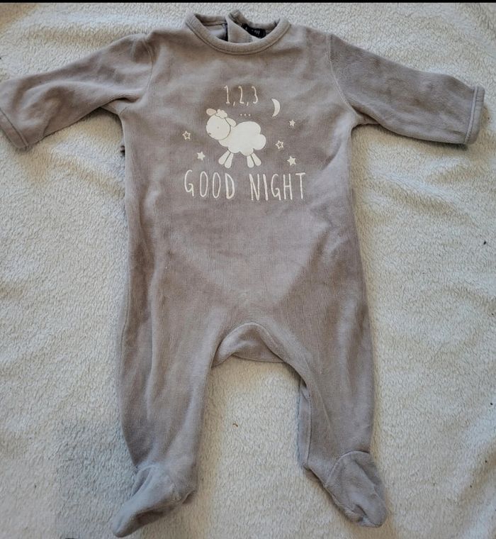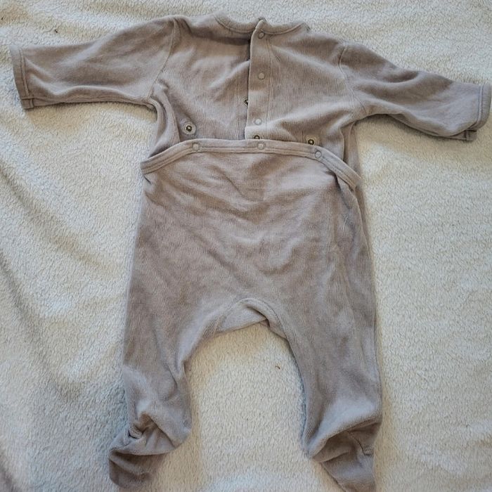 Pyjama en velours Avec pied Ouverture par pression au dos Taille 3 mois ( 56-62 cm) Un peu bouloché mais reste en très bon état car pas de tâches pas de trous