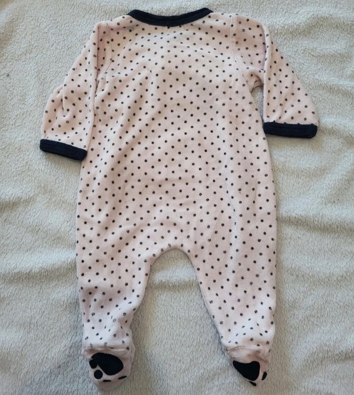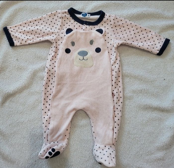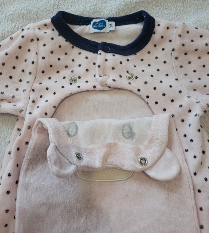 Pyjama en velours Avec pied Ouverture par pression devant Taille 3 mois Un peu bouloché mais reste en très bon état car pas de tâches pas de trous