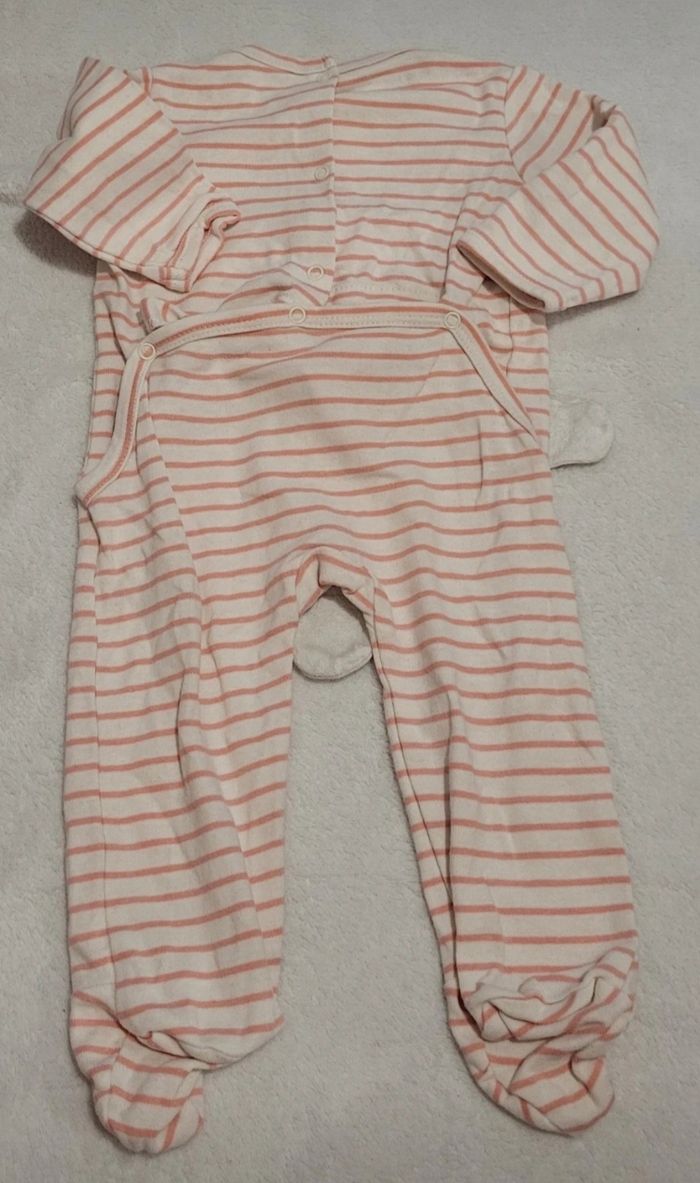 Pyjama en coton Ouverture par pression au dos Taille 6 mois (67 cm) Blanc à rayures rose Un peu bouloché mais reste en très bon état car pas de tâches pas de trous