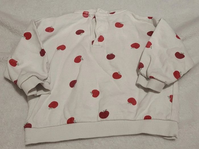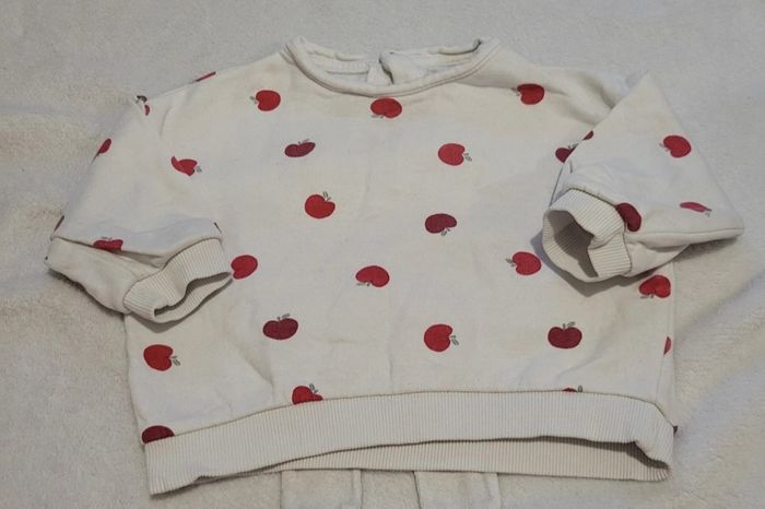 Sweat à motifs pommes 🍎 Ouverture par pression au dos Taille 9 mois (69 - 72 cm) Un peu délavé du aux lavages et un peu bouloché mais reste en très bon état car pas de tâches pas de trous