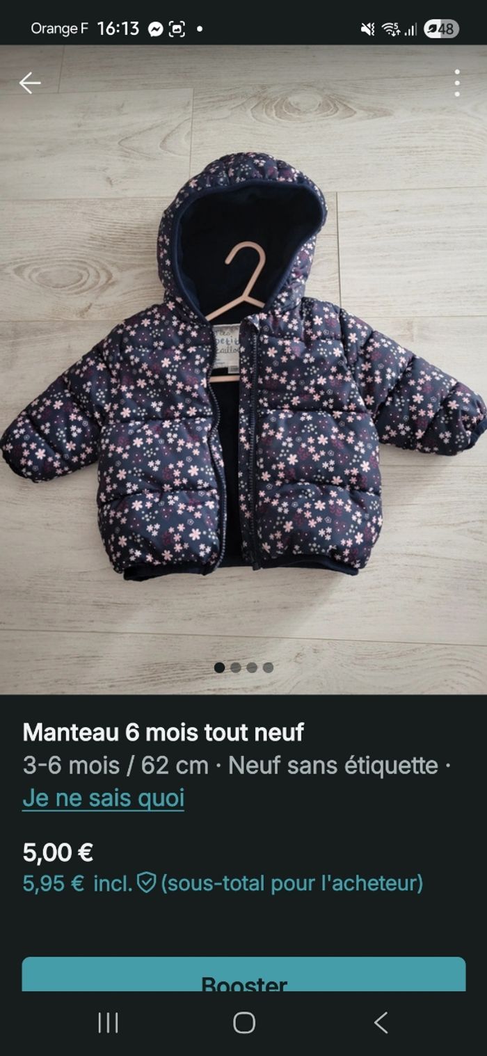 Je vends un manteau fille 6 mois tout neuf jamais mis 5euro