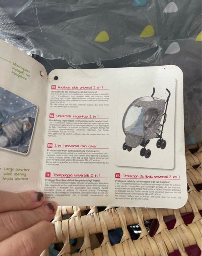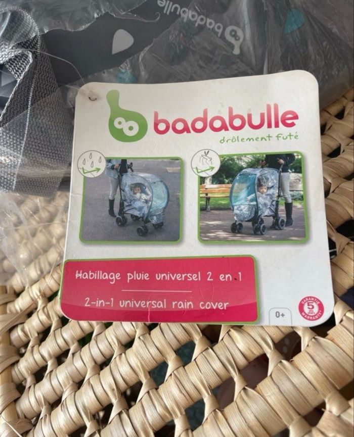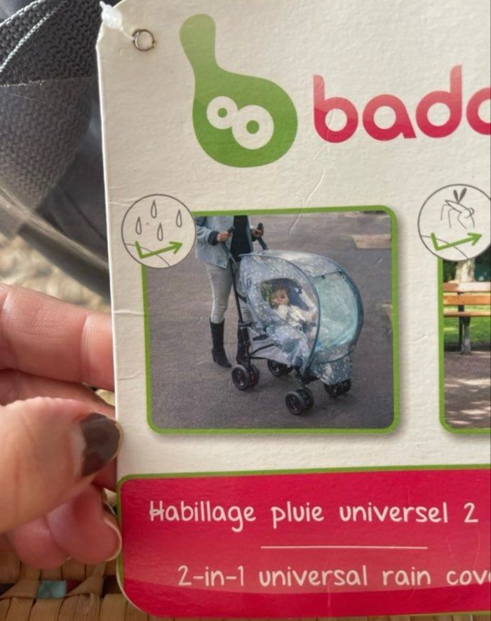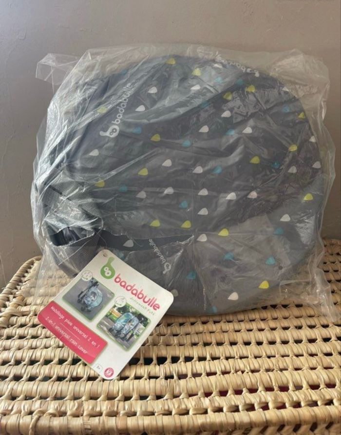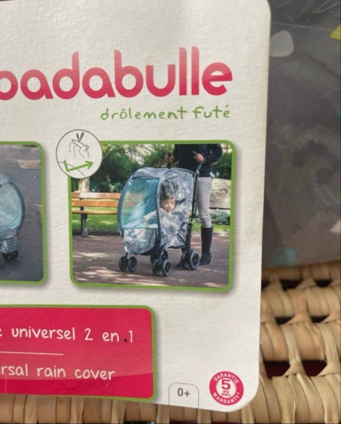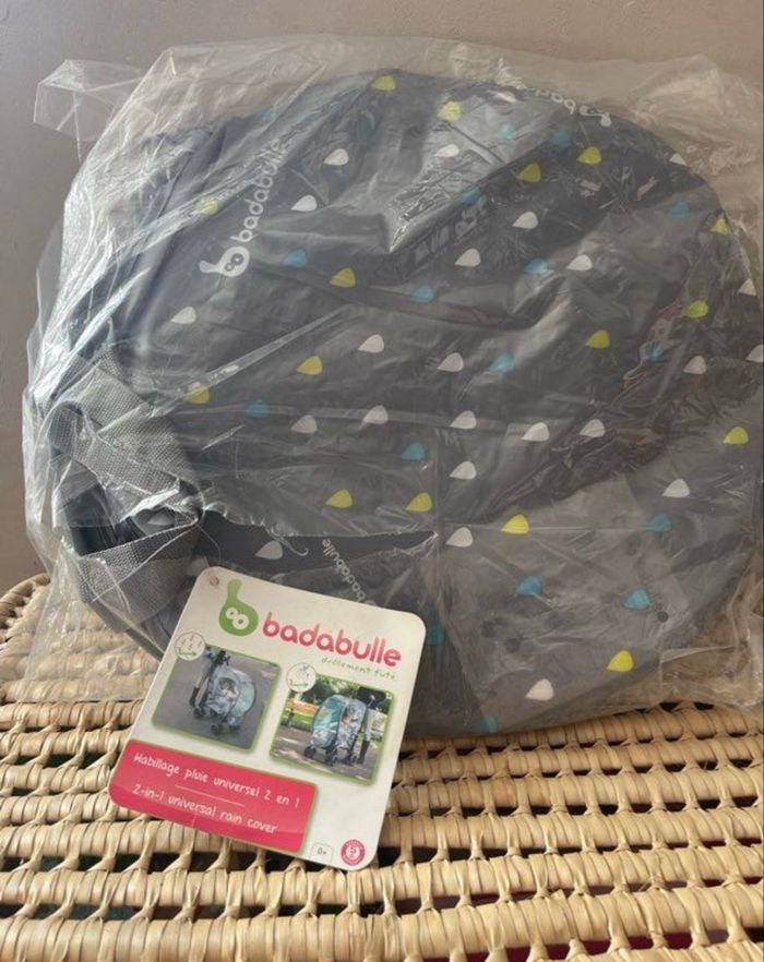 Habillage de pluie pour pousette Modèle universelle Neuf jamais utiliser Pliage pop up, ne prend pas de place une fois plier S’adapte sur toute les poussettes canne Marque Badabulle