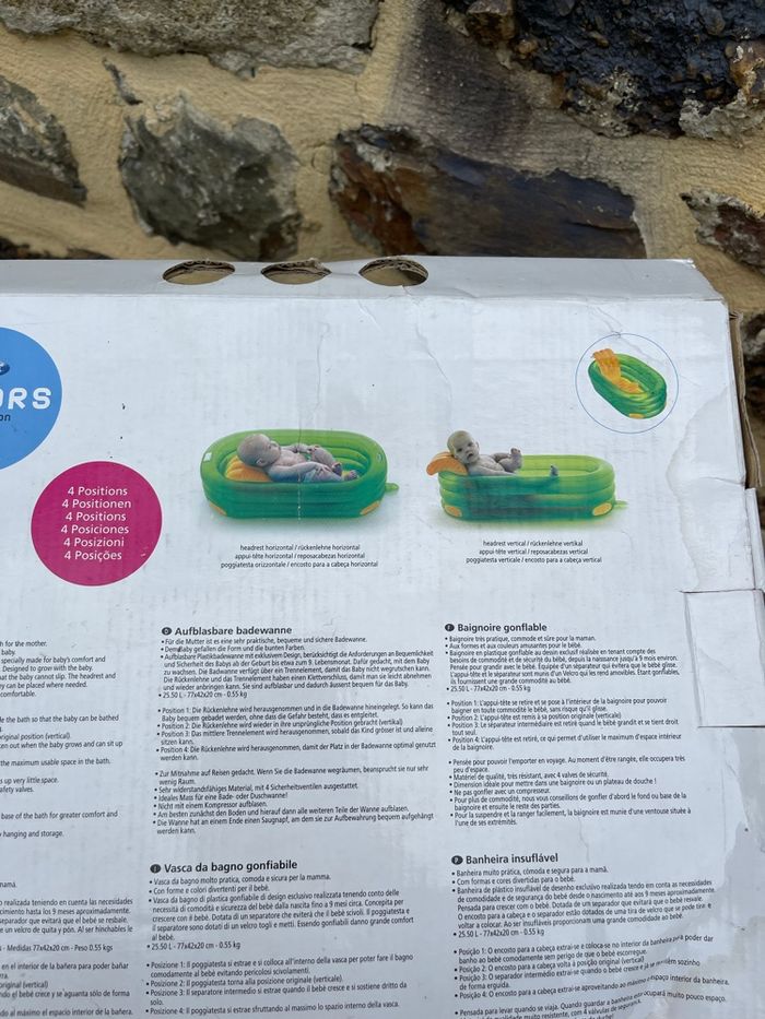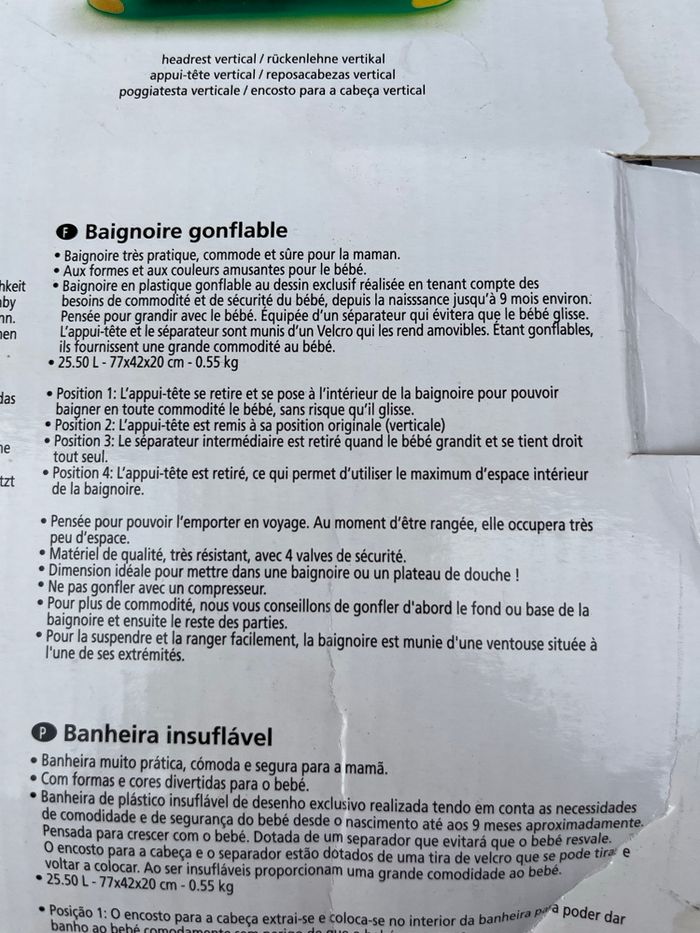 Baignoire de voyage (ou piscine) pour rafraîchir ou donner le bain à bébé; que soit en mode réducteur dans une baignoire (afin de limiter les consommations d’eau), ou si vous n’avez qu’un bac à douche de disponible!… Super pratique que ce soit à votre domicile ou lors de vos voyages (très faible encombrement une fois dégonflée). dimensions intérieurs: longueur: 62cm/ largeur: 30cm extérieurs : longueur: 82cm/largeur: 50cm profondeur: 29cm Marque Jane Acheter 39€