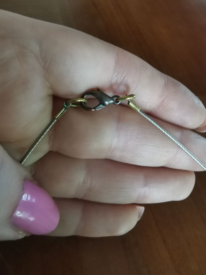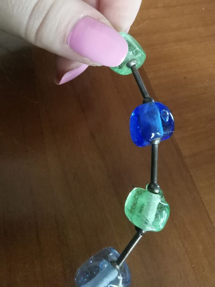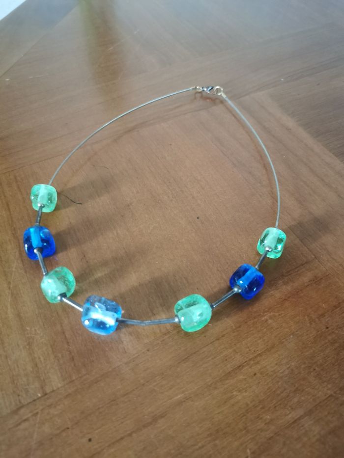 Collier de perles de verre vert et bleu sur un câble argenté - photo numéro 1