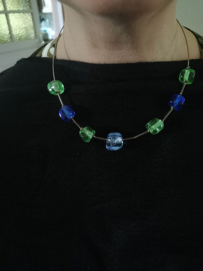 Collier de perles carrées de verre vert et bleu sur un câble argenté, en très bon état. Perles artisanales, donc la taille varie et n'est pas tout à fait identique d'une perle à l'autre. Dimensions : Longueur (tour) : 44 cm Taille de perle de verre : 12-14 mm Poids : 26g