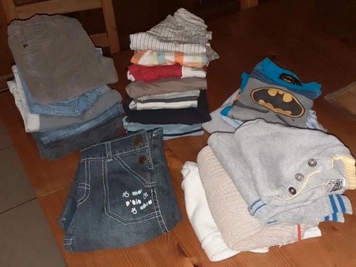 Je vends ce lot de 20 vêtements chauds pour garçon de 12 mois. Prix pour le lot ou possibilité d'acheter à la pièce : - 1 € chaque t-shirt, chemise, body ou le bas de pyjama. - 1,50 € chaque pantalon, pull ou la salopette. Différentes marques (Envoi de photos complementaires sur demande). - Type de produit : Lot de 20 vêtements - Univers : Garçon - Taille : 12 mois / 80 cm - Marque(s) : Tape à L'oeil, Grain de blé, Devilchild, Kitchoun, Batman... - Catégorie : Ensembles & Combinaisons - Couleur(s) : Multicolore - Saison : Hiver N'hésitez pas à me contacter pour plus d'informations.