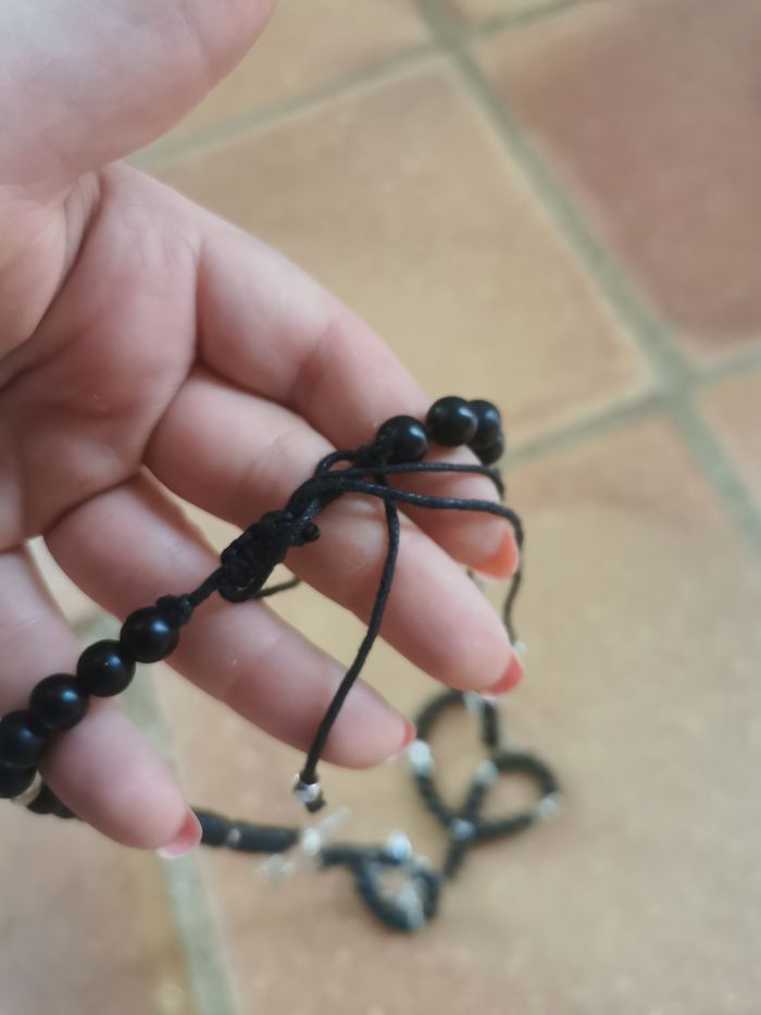 Sautoir vintage de perles noires et étoiles argentées. Sautoir avec les perles noires en plastique enfilées sur le lacet noir avec des perles argentées de différentes formes, dont les étoiles, en très bon état général, il est à enfiler, sans fermoir. Dimensions : Longueur (tour) : 94 cm Diamètre de perles noires : 5 mm Taille d'étoile : 4x3,5 cm Poids : 59g