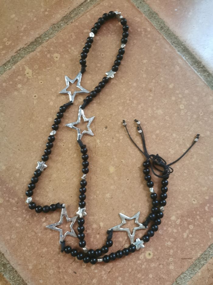 Sautoir vintage de perles noires et étoiles argentées - photo numéro 1
