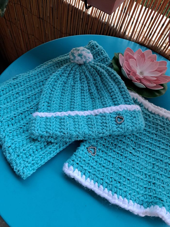 Bonnet et cache cou Bleus Fait main 🩵