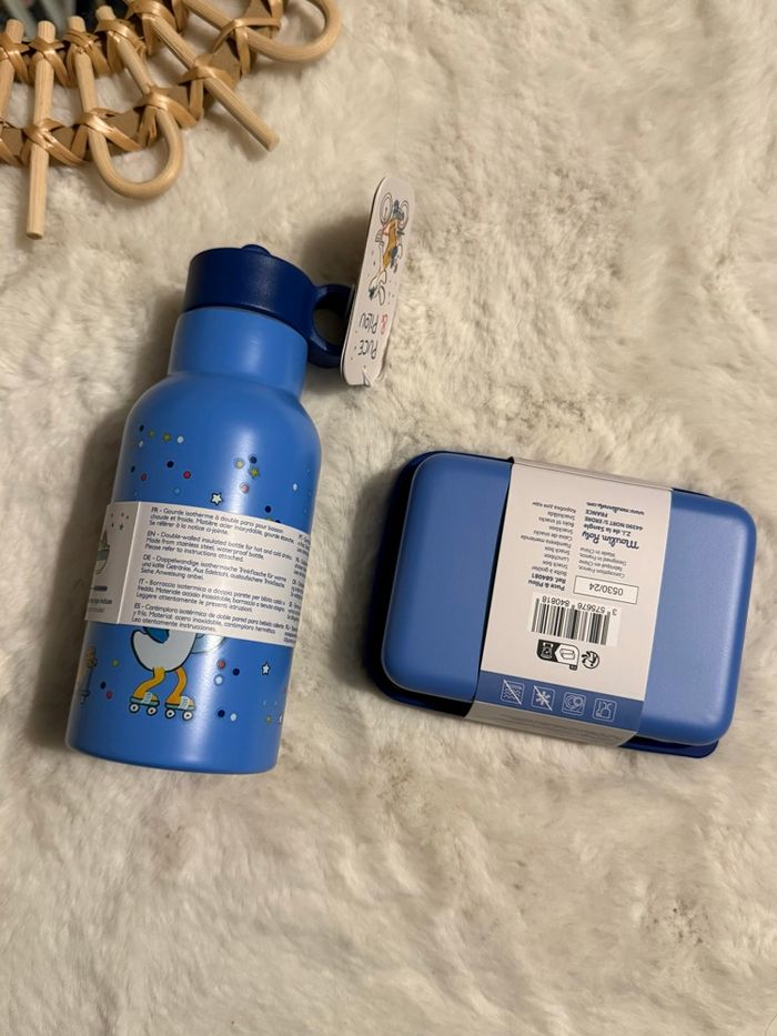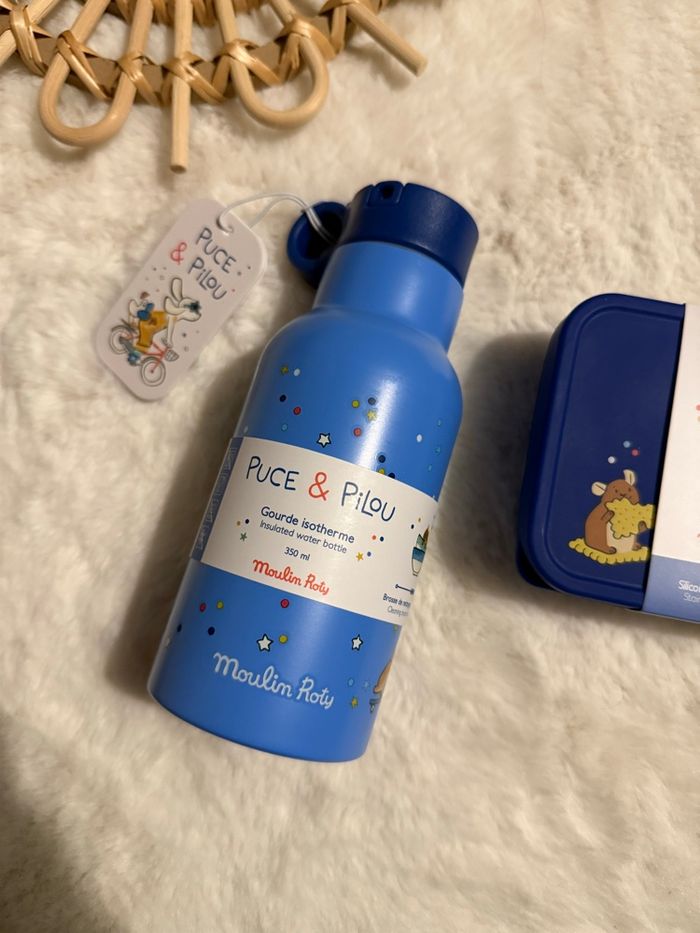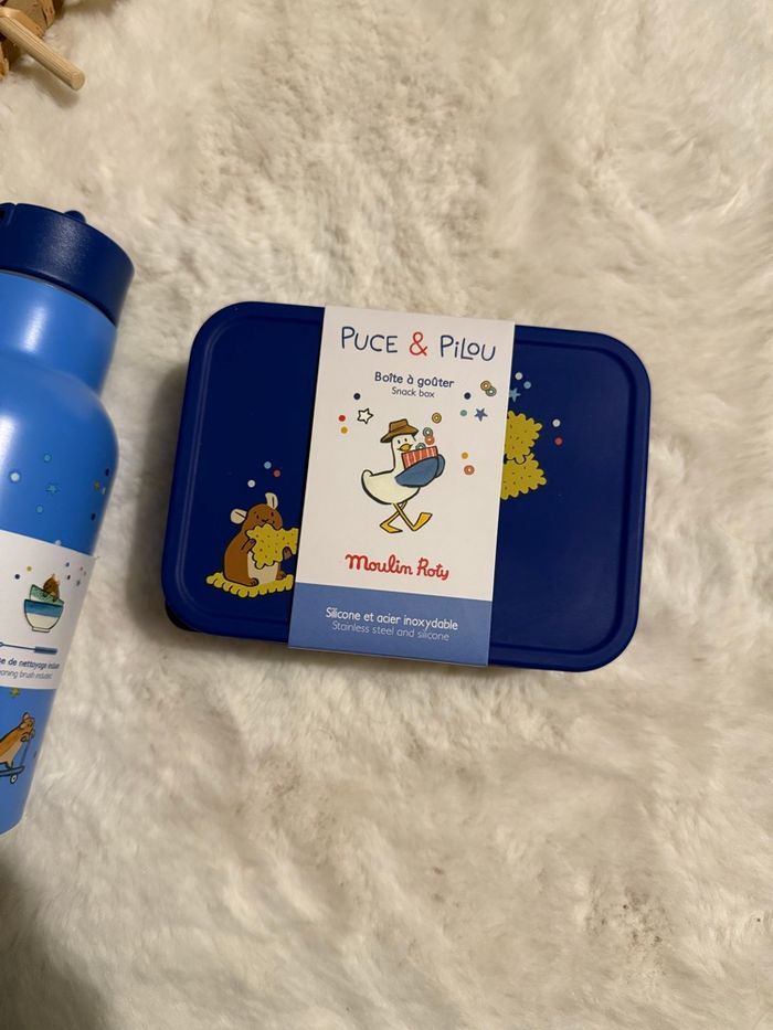 Neuf avec étiquette Lot gourde + boîte à goûter en acier inoxydable et silicone Moulin Roty Prix neuf : - Gourde 19,90€ - Boîte à goûter 18,90€
