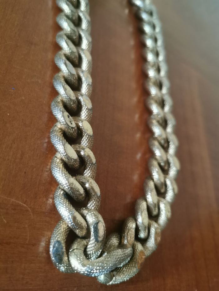Chaîne collier doré de gros maillons à effet tressé, en très bon état général, vintage, avec une rallonge. Joli ras de cou. Dimensions : Longueur : 40 cm + 8 cm de rallonge Taille du maillon : 2x2 cm Poids : 88g