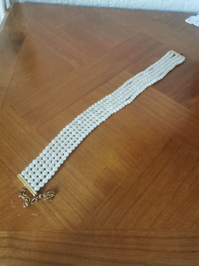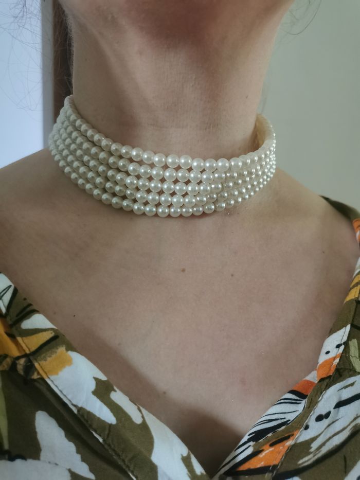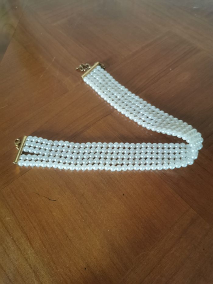 Collier choker de mariée fait de perles blanc nacré. Collier du soir, de sortie ou de maiée, en très bon état, collier à 5 rangées de perles montées sur le support métallique doré avec la rallonge. Dimensions : Longueur : 34,5 cm + 6 cm de rallonge Diamètre de perle : 4 mm Largeur du collier : 3 cm Poids : 36g