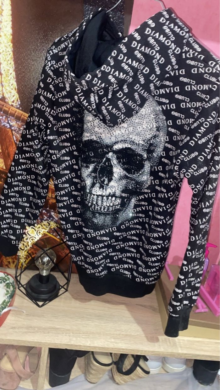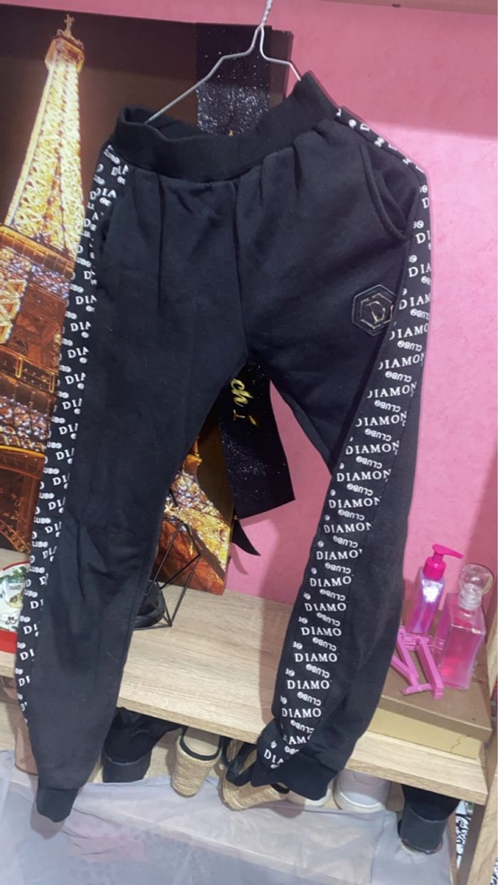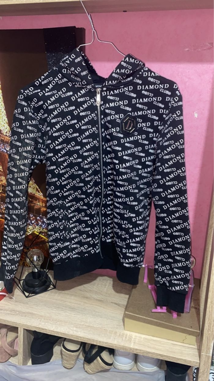 💎💎survêtement- Style et Confort 💎🧥À saisir :veste à capuche et jogging noir avec motif blanc, bord-côtes et poignets côtelés. Prix :6€